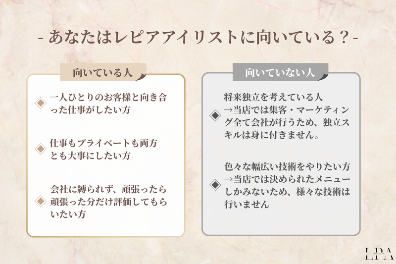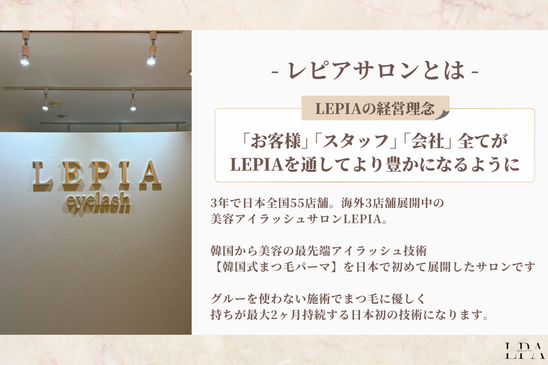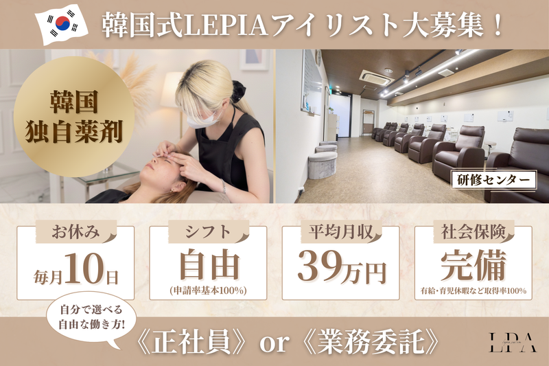 アピールポイント: 【なぜ求人を始めたの?】 ありがたいことに現在、数多くのお客様にご来店いただいており、新規のお客様のご予約を受けきれなくなったため求人をはじめました! 無理な働き方ではなく、今の働きやすい環境を守りながらより多くのお客様をお迎えするために、今回募集を行っています。 ━━━━━━━━━━━━━ 【LEPIAが提供するアイリストの新しい働き方】 <福利厚生の充実と安心して働ける環境> * 最低保証23万円 * 平均月収39万円 高単価サロンのため、無理な予約の詰め込みをしなくても、 安定した収入を得ることができます。 * 月10日休み(年間125日) * シフトは《全て》自分で決定可能 ♪ * 土日祝休みOK! * 毎月連休取得可能! * 長期休暇の取得も可能(最大14日休みでもOK♪) 自分のライフスタイルに合わせて、無理なく働くことができます! * 有給休暇取得率100% * 育児休暇取得実績あり ライフステージが変わっても、安心して働き続けられる環境です♪ ━━━━━━━━━━━━━ <働きやすさを追求した環境> * 客単価10,000円の高単価サロン 業界平均約6,000円に対して、LEPIAの客単価は10,000万円超えの高単価のため、施術人数を増やさなくても、無理なく安定した収入を得ることができます。 * 完全予約制・マンツーマン施術 * 1日4〜6名の施術 * 掛け持ち施術なし 無理な予約の詰め込みがないため、 時間に追われることなく、お客様一人ひとりに丁寧に向き合えます。 * 予約時間に合わせて出勤可能 * 平均労働時間1日約6.5時間 予約時間のみの出勤も可能でサロンでの無駄な待機時間や拘束時間はありません。 仕事とプライベートの両方を大切にしながら働けます。 * 売上ノルマなし * 時間外ミーティングなし * SNS投稿の更新一切なし(本部が対応) 集客や数字のプレッシャーを感じることなく、施術に集中できる環境を整えています。 * 研修制度完備 研修センターでの研修制度を用意しております。専属の講師が徹底的にサポートさせていただくので未経験の方でも安心してスタートできます。 LEPIAで働くスタッフには、今までの美容業界には少なかった「無理なく長く続けられる働き方」を実現してほしいと考えています。 ◆美容の仕事を、安心して続けられる環境を作りたい ◆好きなアイリストとしての仕事も、プライベートも大切にしてほしい ◆この仕事を選んでよかったと思える環境を作りたい そんな想いで、LEPIAを運営しています。