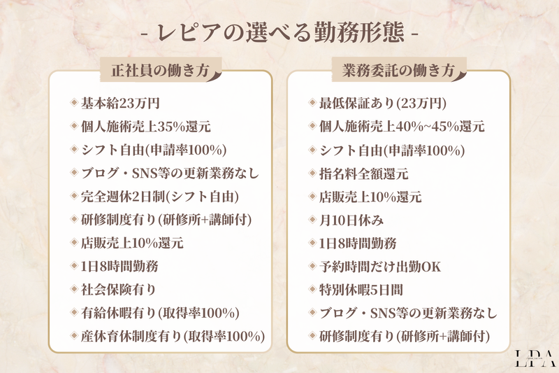 勤務時間・曜日: 【憧れのライフスタイルを、無理なく叶えられる環境】 LEPIAでは、収入だけでなく「好きなアイリストを無理なく、長く続けられること」を大切にしています! 美容のお仕事が好きでも * 休みが少ない * 拘束時間が長い * 収入が安定しない そんな理由で続けられなくなってしまう方が多いのも事実です。 だからこそLEPIAでは 働きやすさと収入の両方を実現できる環境を整えました。 ━━━━━━━━━━━━━ 【業務委託】 営業時間:10:00〜21:00 * シフトは《全て》ご自身で決めていただけます! * 長期休暇可能!(実際に年末年始に14日お休みされた方も♪) * 土日祝お休みOK! * 毎月連休可能! * 毎日9時間の予約枠(うち1時間休憩)を確保しています * ご予約に合わせて出退勤が可能です! * 1日の平均労働時間は約6.5時間 * ミーティングや会議は一切ありません * HPBブログ投稿やSNS投稿は一切なし(本部が全て集客を行なっているので、施術に集中できます。) ◆ご予約に合わせて出退勤とは? 14時からのご予約の場合は、その予約時間に合わせて出勤し、その施術が終わり次第そのまま退勤で切るので、サロンでの無駄な待機時間はありません^^ また、他のスタッフの終わりを待つ必要もなく、仕事後の予定も立てやすいような働き方を整えておりプライベートの時間も大切にしながら働ける環境です♪ ●1日の流れのイメージ● (例①:お客様に合わせて出退勤する日) * 12:00 出勤(予約時間に合わせて出勤) * 12:30~ お客様のマンツーマン施術 * 17:50 施術終了 * 18:00 退勤 (例②:一日出勤する日) * 10:00 出勤(お昼の予約に合わせて出勤) * 10:30~ お客様のマンツーマン施術(4~6名/日) * 18:50 最終施術終了 * 19:00 退勤 ━━━━━━━━━━━━━ 【正社員】 営業時間:11:00〜20:00 * 毎日9時間の予約枠(うち1時間休憩) * シフトは《全て》ご自身で決めていただけます! * 長期休暇可能!(実際に年末年始に14日お休みされた方も♪) * 土日祝お休みOK! * 毎月連休可能! * 残業はありません * 時間外のミーティングや業務は一切ありません * 1日の平均施術時間は約6.5時間 * SNS投稿は一切なし(本部が全て集客を行なっているので、施術に集中できます。) 掛け持ち施術がないため、目の前のお客様に集中しながら余裕を持って働くことができます。 ●一日の流れのイメージ● * 10:30 出勤 * 11:00~ お客さまのマンツーマン対応(4~6人/日) * 19:15 最終受付 * ~20:00 営業終了、帰宅♪