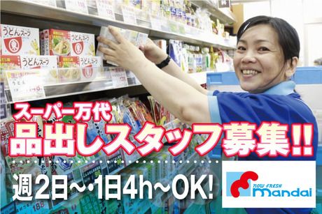 仕事内容 【 仕事内容 】 <グロサリー・デイリー(品出し)コーナー> ・商品の陳列 ・品出し ・整理整頓 ・接客 など。 「商品が補充されずスカスカ」 「ガタガタで見た目が良くない」 そんな売り場にならないよう メンテナンスするのがこのお仕事! お客様から商品の位置を聞かれることも。 売り場までご案内もお願いします。 【 仕事の流れ 】 <1日の流れ(例)をご紹介!※午後勤務の場合> ▼出勤! 売り場での業務スタート! ・商品の取り出し ・陳列/整理 終わり次第、店内チェック♪ ※お客様からお声を掛けられたときは お客様対応優先! ▼お仕事終了! 【 未経験でも安心! 】 <丁寧な研修&フォロー体制が自慢!> 社員やベテランスタッフが陳列や 品出しのコツを伝授! ・商品がキレイに見えるようフェイスアップ ・賞味期限が早い順に前出し など あなたの手でキレイな売り場を 作り上げてくださいね♪ キレイになった売り場を見ると 達成感や充実感もありますよ! 【 万代の魅力 】 <「万代スタッフに聞いた!」働く魅力をご紹介!> ・家から近く通勤しやすい! ・お仕事終わりに買い物ができる♪ ・新人さんも馴染みやすい◎ ・常連さんが気さくに話しかけてくれる! ・髪型・髪色・ネイル・ピアスなど身だしなみは比較的自由! 自分らしく働ける環境で、のびのびと活躍できます。 「私でもできそう!」「やってみたい!」 そんな方はぜひご応募ください♪ スタッフ一同、あなたからのご応募お待ちしております!