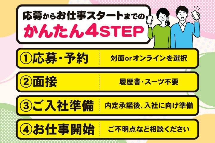 応募方法 【1】応募フォームよりご応募ください。 【2】面接日時ご調整のご連絡をいたします。 └ WEBでの予約もOK!(SMSにてURLをお送りします) 【3】オンライン面接1回 └ 服装自由!履歴書も不要です 【4】お仕事のご説明&職場見学 【5】お仕事開始 └ 安心して働けるよう積極的にサポート! └ 入社時期はお気軽にご相談ください◎