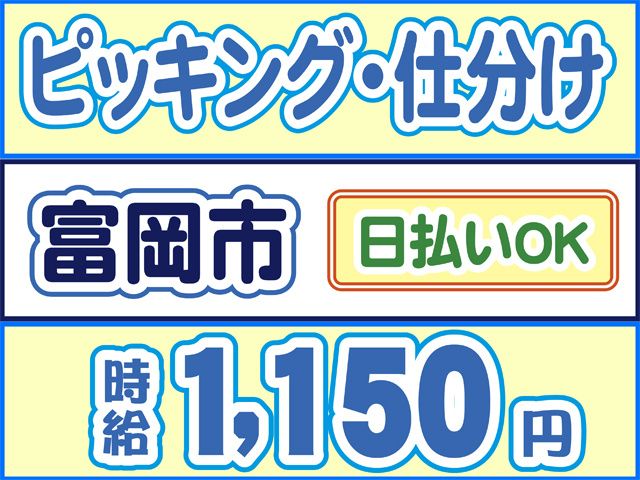 仕事内容 大手企業で長期安定のカンタン軽作業 スーパーなどで良く見かける人気の商品 初心者さんから50代60代の中高年・シニアも活躍中 【食品のピッキングスタッフのポイント】 〇未経験OK 〇シンプル・もくもく作業 〇時給1,150円 〇日勤のみ 〇うれしい土日祝休み 〇20代30代40代50代60代の男女活躍中 〇空調完備 〇交通費支給(規定内) 〇履歴書不要 〇日払いOK(規定内) 〇「マイリク定着支援」導入企業! 【食品のピッキングスタッフのお仕事】 富岡市にある大手企業の倉庫内でのお仕事。 具体的には、 製造されたゼリー製品の ・仕分け ・ピッキング を お願いします 重たい物はないので未経験も安心 先輩スタッフが丁寧に指導してくれます 簡単な軽作業で難しい作業はありません。 分からないことなどは社員さんが親切に 指導してくれるので安心して始められます。 30分~1時間程度の職場見学を実施しております。 【食品のピッキングスタッフの勤務について】 〇土日祝休みの週休2日制 ※長期連休あり 〇日勤のみ(8:30〜17:15 ※実働7時間30分)) 急な発熱・体調不良・冠婚葬祭など、 突発的なお休みに柔軟に対応しております。 【こんな経験活かせます!】 下記経験者は前職活かせます。 ・食品製造パート・アルバイト ・軽作業パート・アルバイト ・仕分け・ピッキングパート・アルバイト ・倉庫内派遣 ・食品工場派遣 ・主婦パート(職種不問) ・中高年(シニア)パート 前職不問で採用しております。 ブランクOK、経験の浅い方もOK 友達との応募もOK ご不明な点はお気軽にお問い合わせください お電話でのご応募、ご質問も受付中! 株式会社ロフティー 高崎支店 TEL0800-222-6888(フリーダイヤル) お仕事情報など採用ページはこちらから https://entori.jp/loftygunma コーディネーター・定着支援のWサポート体制導入 「マイリク定着支援」導入企業! アンケートで職場の様子を確認し、 コーディネーター・定着支援担当が連携してサポート。 はじめての派遣でも安心して働けるよう迅速かつ 丁寧にサポート対応いたします。