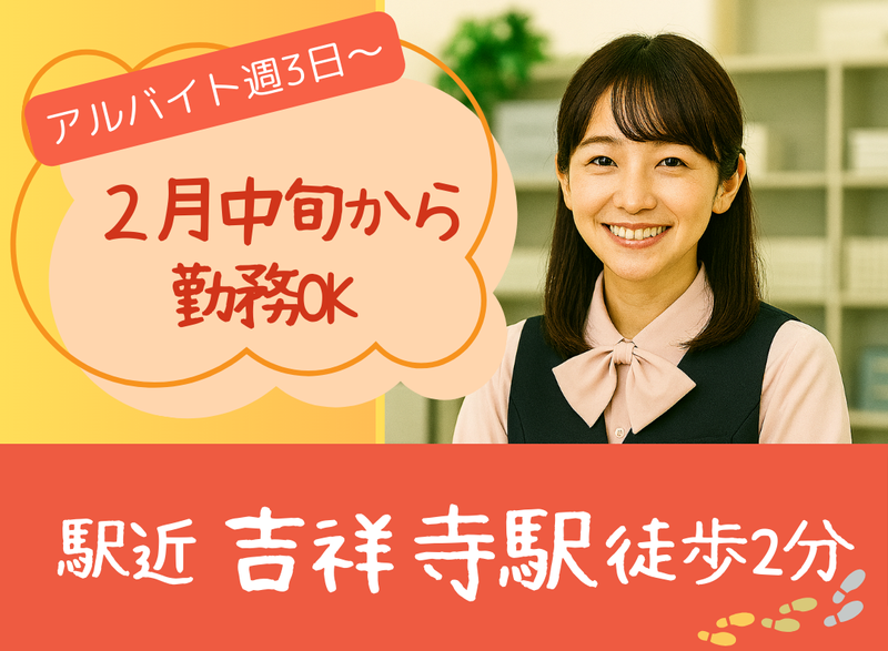 仕事内容 < 短期募集!未経験でも活躍できます > 武蔵野公会堂にて 受付事務スタッフの募集♪ 未経験スタートの主婦や、 「子育てが落ち着いたから仕事復帰」 というブランクあけの主婦(夫)さんも大歓迎♪ 気軽にご応募ください◎ ※2026年2月中旬~6月までの短期募集! (公会堂の改修工事に伴い、期間が短くなる可能性もございます) ー < 人気エリアの駅チカで通いやすい! > 武蔵野公会堂は 「吉祥寺駅」から歩いてスグ♪ 仕事終わりにはショッピングも! 無理なく通勤できるのが嬉しい ー ◆お仕事内容◆ ◎劇場や会議室の利用受付をお任せ致します。 ・備品貸出 ・料金精算(電子マネーの取扱い有) ・片付け、電話応対 等 ◎市内の公共施設での催物のチケット予約販売もお任せ致します。 ◇PCを使っての事務作業が中心です