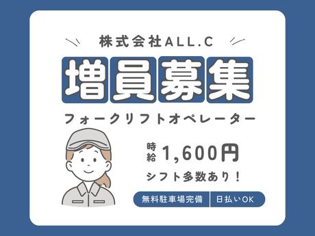 選考プロセス 【1】応募 ・WEB(24時間受付) …翌営業日以内にご連絡いたします。 ・TEL(平日9:00~18:00) …「館林事業所の求人を見た」とお伝えください。 【2】面接 ・現地面接 …倉庫入口で担当者と集合します。 ・WEB面接(zoom) …事前に履歴書をご送付ください。 後日現場見学(FLスキルチェック)を行います。 【3】採用 一緒に働けるのを楽しみにしています♪ 【問合せ先について】 問合せ先:0120-676-660 面接日・入社日の相談可能! ご不明点等ございましたら、お気軽にお問い合わせください。 【公式HP】https://www.all-c.co.jp 【TEL】0120-676-660(フリーダイヤル) 応募方法 ┌――――――――――┐ TEL応募:平日9~18時 WEB応募:24時間受付中 ★面接時間の相談可能★ └――――――――――┘