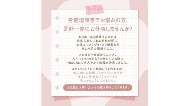 求めている人材 【必要資格】美容師免許 ◇応募条件◇ ◎スタイリスト経験 ◎ジュニアスタイリスト経験 のいずれかがあればOK! ブランク/産休育休明け/他業種転職 などの方も大歓迎です!!