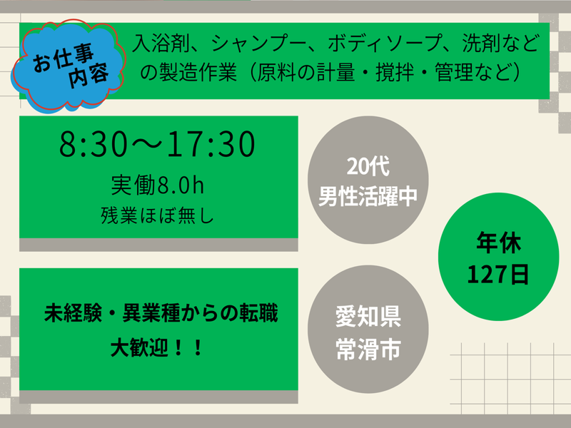 仕事内容: \男性スタッフ多数活躍中!/ 体を動かしてガッツリ稼ぐ製造スタッフ募集! 未経験でも大丈夫、心配ご無用! ▶個々のペースに合わせた研修でスタート! ▶困ったらすぐ相談できるサポート体制も! 「初めての製造業だけど挑戦したい」 「以前の工場経験を活かしたい」 まずは希望や気になること、 なんでも教えてください✨ 一緒に高収入を目指しましょう♪ ✽───────────────────── │【必見!】✨求人のポイント✨│ ───────────────────── ✅ 誰もが知る“あの商品”を自分の手でつくれる! ✅ 未経験者大歓迎! 丁寧な研修で安心スタート ✅ 冷暖房完備のキレイな工場で快適勤務 ✅ コツコツ作業とチームワークを両立できる ✅ 男性スタッフ多数!明るくフランクな職場 ✅ 年齢・経験不問! 幅広い世代が活躍中 ─────────── │お仕事内容について│ ─────────── 入浴剤やシャンプーなどの製造スタッフとして、以下のいずれかの工程をお任せします。 【製造】 原料の計量、撹拌(かき混ぜる)、管理など 【充填】 液体・粉末製品の容器詰め、袋詰め 【梱包】 製品の箱詰め、ラベル・日付印字の確認 ▶ 毎日使う身近な商品を通じて、人々の暮らしを支えるやりがいのある仕事です。 ▶ 各工程にはマニュアルがあり、集中して作業に打ち込めます。 ▶ スタッフ同士の連携も密で、困った時は助け合えるチームワークの良い職場です。 ─────────── │働くスタッフの声│ ─────────── 「工場勤務は初めてでしたが、先輩が丁寧に教えてくれたので安心でした。 自分が関わった商品がお店に並んでいるのを見ると、やっぱり嬉しいですね。」(30代男性/元コンビニ店長) 「職場のほとんどが男性で、冗談を言い合える雰囲気です。 作業は黙々と進めつつも、仲間意識が強くて居心地がいいです。」(20代男性/未経験) オービックは安定して働ける職場をご案内します ◆ 子育てと仕事の両立ができる職場を探している ◆ 家族との時間を大切にしたい(日勤のみ&土日休み) ◆ キャリアアップを目指したい(資格支援や正社員登用あり) どんな仕事がいいかお悩みの方は、まずはお仕事選びで大切にしているポイントを教えてくださいね♪ ___________________ ◆紹介先:健美薬湯株式会社 ◆紹介元:株式会社オービック ◆紹介後の雇用形態は正社員となります。  ̄ ̄ ̄ ̄ ̄ ̄ ̄ ̄ ̄ ̄ ̄ ̄ ̄ ̄ ̄ ̄ ̄ ̄
