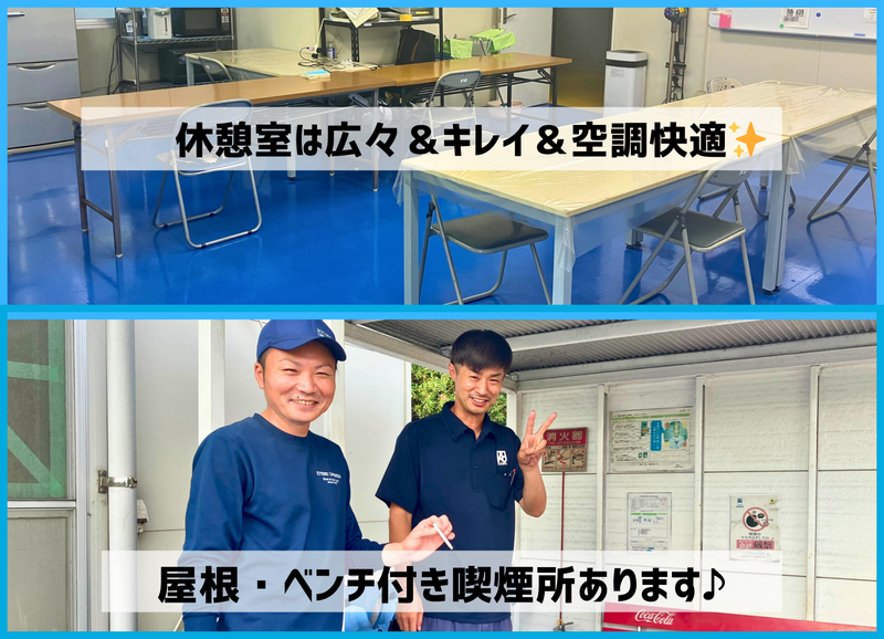 職場環境 構内に食堂があり、弁当注文もできます(500円程度)事務所に配達もしてもらえるので便利です♪ 男性中心の職場で、みんな優しくていい人ばかり。長年活躍している先輩もたくさんいます! 早く新人さんが入ることを楽しみにお待ちしてます✨ 喫煙所:喫煙所あり(屋外) 外に屋根付き&ベンチがある喫煙所があります。 休憩スペースとしても人気の場所です♪ いくつか喫煙所があって便利です☆ タバコ休憩の時に雑談したり、みんな仲良しです✨