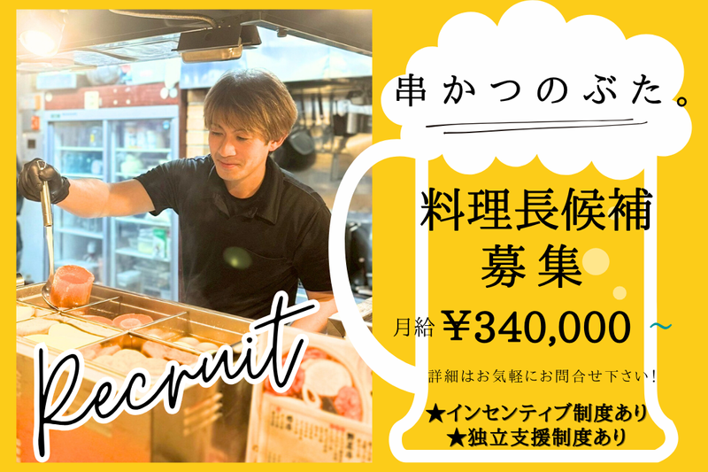仕事内容 •—•—•—•—•—•—•—•—•—• 月給34万円~דリーダーを育てる会社” ☆☆レイリーフードテック☆☆ × ☆☆串かつのぶた。☆☆ 次のキャリアをつかむ “料理長候補”募集!! •—•—•—•—•—•—•—•—•—• \レイリーフードテックで働くポイント/ ★ 全員インセンティブ制度 → チームで成果をわかちあう文化 ★ “役職ではなく役割”を重視する、 人が育つ組織 ★ キャリアステップ明確 → 一般→店長→SV→部長→独立も ★ 飲食×マーケ支援の多角経営 → 成長性と安定性の両立 ★ 独立支援制度あり (店長経験3年~、資金含め伴走) ··—··—··—··—··—·· 【仕事内容】 キッチン全体の運営・管理をお任せします。 “味づくり”と“人づくり”の両方に関わり、 厨房からお店を支えるポジションです。 ◆ 仕込み・調理・盛り付け ◆ 食材管理・衛生管理 ◆ 原価管理・メニューコスト設計 ◆ キッチンスタッフの育成・ポジション配置 など まずは、現場で「のぶたの味」を掴んでいただき、 その後「品質を安定させる → 人を育てる → キッチンを動かす」へと 段階的にステップアップしていきます。 ※マニュアル調理ではなく、 素材や衣、揚げ油の“仕込み”から 丁寧に学べる環境です。 ··—··—··—··—··—·· 【レイリーフードテックってこんな会社!】 代表の飯田・村上は、 元々同じ飲食企業で働いていた仲間。 「自分たちの力で、お店や人の未来を つくれる会社をつくりたい」 その想いから、2022年に レイリーフードテックを創業しました。 掲げたミッションは “ライズリーダー(リーダーを輩出する)”。 ★ 役職ではなく「役割」で評価する ★ 人が育てば、会社は強くなる ★ 「入ってよかった」と胸を張れる職場にする この価値観を軸に、 評価・研修・キャリア制度のすべてが “人を育てるため”に設計されています。 現在は、水戸・つくば・いわきにて 6店舗を展開。2036年に100店舗、 上場を目指し、拡大中です。 さらに、私たちは “飲食だけの会社”ではありません。 SNS運用支援、 マーケティング支援などの事業も行い、 地方企業が「勝てる仕組み」を つくる力にもなっています。 そして今、より大きな成長を見据え、 グループ会社 「レイリーホールディングス」を設立。 今後はM&Aを含め、 飲食以外の領域にも挑戦していきます。 “数字にコミットする”プロの視点と、 “想いや理念に寄り添う” 人間的な関わりを両立させながら、 地域から挑戦する人と企業を 増やすことを目指しています。 → 飲食×人材育成×マーケ支援 を軸にした多角展開のため、 会社としての成長性・安定性が 両立しているのが大きな強みです。 ··—··—··—··—··—·· 【展開ブランド】 ・串かつのぶた。(自社業態) ・0秒レモンサワーときわ亭(FC) ・鮨酒肴 杉玉(FC) 【『串かつのぶた。』について】 大阪のソウルフード「串カツ」を 気軽に楽しめる、自社オリジナルブランド。 素材・衣・揚げ油にこだわり、 ひと串ひと串を丁寧に仕上げています。 看板メニューは【のぶた名物】 リブロース仕込みの極みぶた串かつ。 肉の旨みと衣の軽さが絶妙にマッチした、 自慢の逸品です。 また、効率的な導線設計により、 スタッフの負担を減らしながら スピーディーな提供を実現。 ホールとキッチンが連携し、チームで お客様を楽しませる空間です。 ··—··—··—··—··—·· 【ここが魅力!】 ◆ 評価は“リアルタイム推薦制” SV・店長が日常での成長を見て、 必要なタイミングで昇格を推進。 ◆ インセンティブは全員対象 個人戦ではなく“チームで勝つ”文化。 ◆ 育成に強い会社 数字管理・マネジメント・リーダーシップなど “店長で終わらない人材”をつくる研修体制。 ◆ キャリアステップが明確で速い 一般 → トレーナー→マネージャー → 主任 → 副店長 → 店長代行 → 店長 → リーダー → SV → 部長 + SNSマーケチームの道にも挑戦可能 ◆ 実績 ・副店長入社 → 2ヶ月で店長代行 ・店長入社 → 約1年でSV昇格 ◆ 独立支援あり(店長3年〜) 資金/計画/運営ノウハウまで伴走。 特に 「串かつのぶた。」は独立モデルとして相性◎ ◆ 待遇面もしっかり ・昇給あり ・決算賞与(業績による) ・全員インセンティブ ・家族手当(子ども1名につき1万円) ・まかない ・資格取得支援(衛生/防火管理者など会社負担) ・ネイル・髪型自由 ・車/バイク通勤OK(駐車場あり) ··—··—··—··—··—·· 「仲間と店をつくる。 自分の力で未来を切り開く。」 レイリーフードテックは、今まさに拡大期。 新しい店舗・新しいポジションが 次々と生まれているため、 “役職の空き待ち”はありません。 実際に、入社数ヶ月での昇格や、 店長 → SV へのスピード昇進も多数。 その背中を見て、“アルバイトから社員へ ”チャレンジしたメンバーもいます。 “誰かの活躍が、次の挑戦を生む”。 そうやって、 成長の連鎖が続いている会社です。 その面白さを、 ここで一緒に味わいません