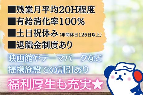 【保険制度】 雇用保険、労災保険、健康保険、厚生年金 待遇・福利厚生 【福利厚生】 ・社会保険完備 (雇用保険・社会保険・労災保険) ・退職金制度あり(規定あり) ・育児介護休暇あり ・映画館やアミューズメント施設 &グルメ割引チケットあり★ ・有給休暇制度 ・有給取得率100% ・お友達紹介ボーナスあり ・産休育休の実績あり ・ You & meボーナス (お友達紹介ボーナス)