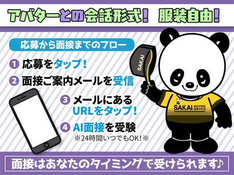 選考プロセス \ AI面接実施中 / AI面接なら365日・24時間いつでもどこでも面接可能◎ 今日明日なら時間が空いている…という方もOK! ▼応募から面接までのフロー - 応募する ↓ AI面接のご案内メールを受信 ↓ メール内にあるURLをタップ ↓ AI面接を受験 【24時間いつでもOK!】 - アバターとの会話形式!服装自由! 面接はあなたのタイミングで、 リラックスして面接ができます♪ 【問合せ先について】 問合せ先:050-3495-5823 引越のサカイは初バイトを応援! 面接マナー等も気にしないでOK♪ 電話応募は、代表電話番号での応募は 受け付けておりませんので、 ご注意ください。 応募方法 応募ボタンをタップし、 表示された応募フォームへ 必要事項を入力してご送信ください。 【電話でのご応募】 050-3495-5823(採用担当) 受付時間/9:00~18:00