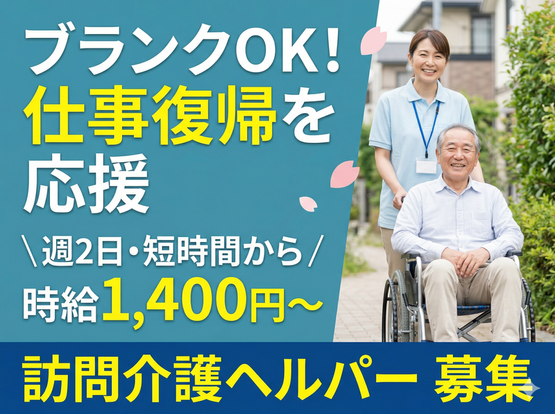 仕事内容: 【久しぶりのお仕事復帰、全力でサポートします!】 「資格はあるけど経験が浅い」 「数年のブランクがあって不安」 という方も大歓迎です✨ 訪問介護は一人ひとりの利用者様とじっくり向き合えるため、自分のペースで着実に感覚を取り戻していける環境です。 ・・・・・・・・・・・・ 【具体的なお仕事内容】 ご利用者様宅を訪問し、日常生活のサポートをお願いします。 ・生活援助(調理、掃除、洗濯、買い物代行) ・身体介助(食事、入浴、排泄等の介助) ・・・・・・・・・・・・ 【ブランクがあっても安心のポイント】 ✅フォロー体制 分からないことはすぐに聞ける環境で、無理なく再スタートできます。 ✅柔軟なシフト 週2日・1日2時間から勤務可能。体力に合わせて少しずつ勤務時間を増やすことも可能です。 ✅高水準の給与 時給1,400円〜1,850円。早朝夜間や土日祝はさらに時給アップし、効率よく稼げます。 「もう一度、介護の仕事で誰かの役に立ちたい」というあなたの想いを大切にします。 マイカー通勤も可能(無料駐車場あり)ですので、通勤も快適です✨ まずは短時間から、今の生活リズムに合わせて始めてみませんか?