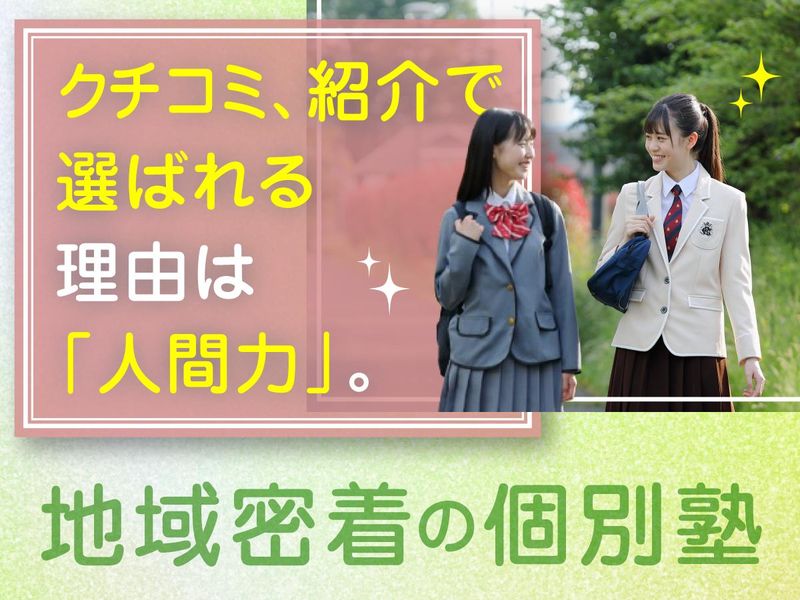 職場環境 30代の教室長をはじめ、20代、30代の若手、学生の塾講師アルバイトが活躍中! 無理な残業や大手にあるような細かな決まりはなく、スタッフ同士の相談も活発。 なにかあれば協力し合い、生徒に優しく寄り添って働ける、明るくあたたかい職場環境が自慢です◎