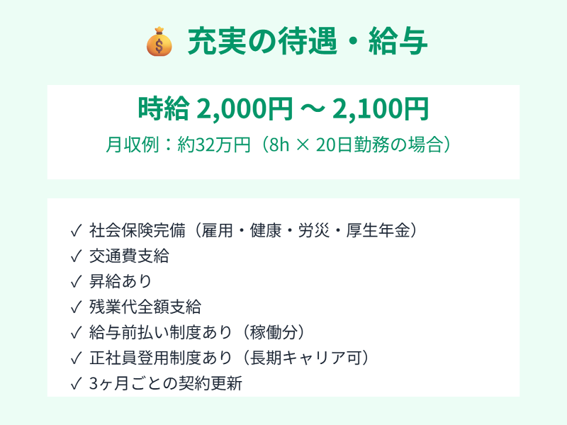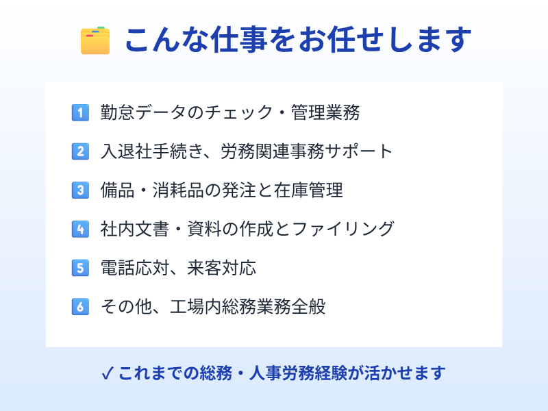 アピールポイント: 大手メーカー工場内での総務・人事労務サポート業務です。 時給2000円~の高待遇に加え、土日祝休みで生活リズムも安定。 冷暖房完備の快適な職場環境で、同じ業務を担当するスタッフが複数名在籍しているため、分からないことはすぐに相談できます。 業務フローが整っており、経験を活かしながら安心して働ける環境です。 正社員登用の可能性もあり、長期的なキャリア形成を目指したい方にもおすすめです。
