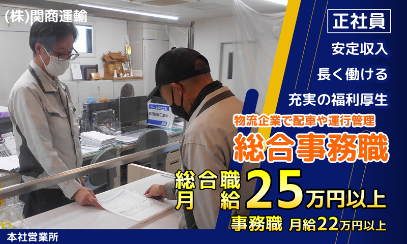 仕事内容 運送会社の管理業務は、モノ・ヒト・業務の管理と多岐にわたります。 トラックの整備管理、トラックドライバーの運行管理/労務管理、倉庫の運用管理、受注配車の管理、安全管理など.... このように管理スタッフは、運送会社の司令塔です。 当社では、司令塔を強化するため、管理業務を行うスタッフを募集します。 運送会社の事務業務は、電話応対、データ入力、伝票処理、請求書発行と多岐にわたります。 事務スタッフは、運送会社の物流・運送業務全体を支え、円滑な運営に欠かせません。 当社では、各種業務の後方支援を充実するため、事務業務を行うスタッフを募集します。 管理業務も事務業務もトラック輸送、フォークリフト作業、工場内作業など現場業務を支える重要なお仕事です。 「人のサポートが好き」な方には、最良の職種・職場です。 【仕事の魅力】 当社は、運送・倉庫・請負/派遣・自動車整備と幅広い事業を手掛ける「総合物流会社」です。 「物流業に興味があり、会社を良くするための企画・提案をしてみたい」心意気のある方は是非当社に! 【経験者優遇】 同業他社での実務経験がある方、異業種での管理/事務経験がある方は是非、経験・スキルをお聞かせください。 入社時の給与待遇を考慮いたします。業務リーダそして幹部スタッフを目指してください。 【未経験者歓迎】 将来の幹部スタッフを目指してください。 入社時は事務スタッフ、事務業務を通じ、物流・運送業の業界知識・商慣習がわかったら管理業務へのキャリアアップ、当社は応援します。