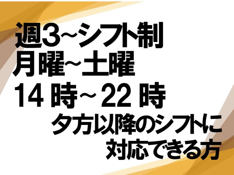 勤務時間詳細 14:00~22:00の時間内で4~5時間の勤務をお願いします。 (夕方以降の時間にご勤務可能な方に限ります) ・週3日以上勤務できる方歓迎 ・勤務時間、勤務曜日等は考慮いたします。 別途、週5日フルタイム(14:00~22:00)の勤務が可能な方も募集をしております。