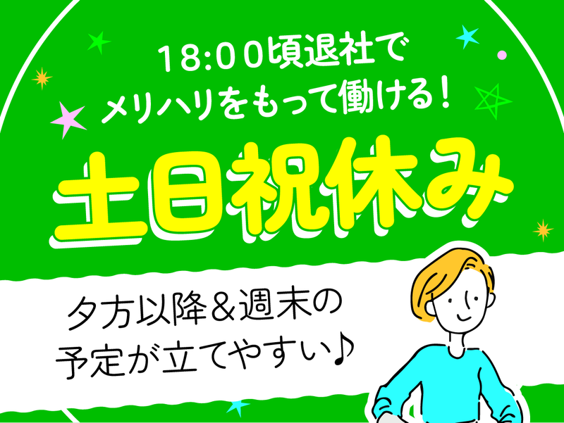 勤務時間詳細 <勤務日数> 月~金の週5日勤務 <勤務時間> 8:50~17:50(実働8時間) ※日々18:00までの残業あり