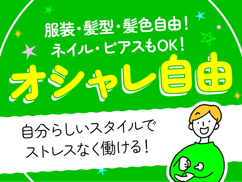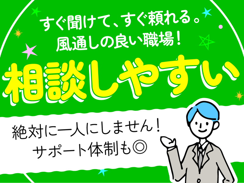 職場環境 「孤独感がない」「効率重視より自分に合う」と現役スタッフから大好評!迷った時は頼れる管理者が状況整理や判断をすぐサポートしてくれます。メンバー同士で相談しやすく、コミュニケーションを取りながら進められるため安心感は抜群!長く続けやすい自慢の職場です。 喫煙所:喫煙所あり(屋内) 受動喫煙防止措置:屋内原則禁煙(喫煙専用室設置)