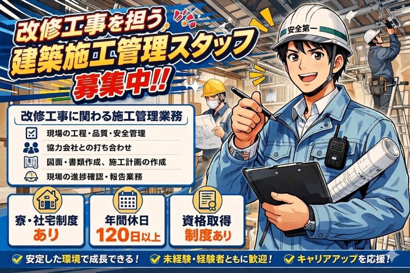 【仕事内容】 \建築施工管理経験をお持ちの方、必見/ 高品質と信頼に基づき、多くの依頼に対応するため、建築施工管理スタッフを募集いたします。 【おすすめPoint】 ■寮・社宅制度あり ■年間休日120日以上 ■資格取得支援制度あり 【仕事内容】 ▶改修工事に関わる施工管理業務を担当します。 【具体的には】 ・建築物の施工・安全管理、品質管理、工程管理 ・発注者との打ち合わせ、折衝 ・現場作業の手配、指揮 ・報告書作成 など =========================== 培った技術と経験を活かせる場所がここにある 現場を知るあなたの力が必要です! =========================== 建築施工管理のご経験がある方はぜひご応募ください! ✅家族手当や資格手当あり ✅週休2日制・資格取得支援あり ✅各種手当多数あり 充実の福利厚生で働きやすさも抜群。頑張ってスキルアップをした分は、資格手当もありますのでぜひご活用ください! ======================= 効率的に働いて、しっかり休める職場! ======================= ■現場へは直行直帰で移動の負担軽減 ■現場の事務所内で事務処理が可能 など、業務のムダを省き、社員の負担を最小限にすることで、基本定時退社を実現。 残業は月10~20時間程度と少なめで、案件が一区切りついたら長期休暇の取得も可能です! ▶あなたのご応募お待ちしております! 【求人ID-MFB】