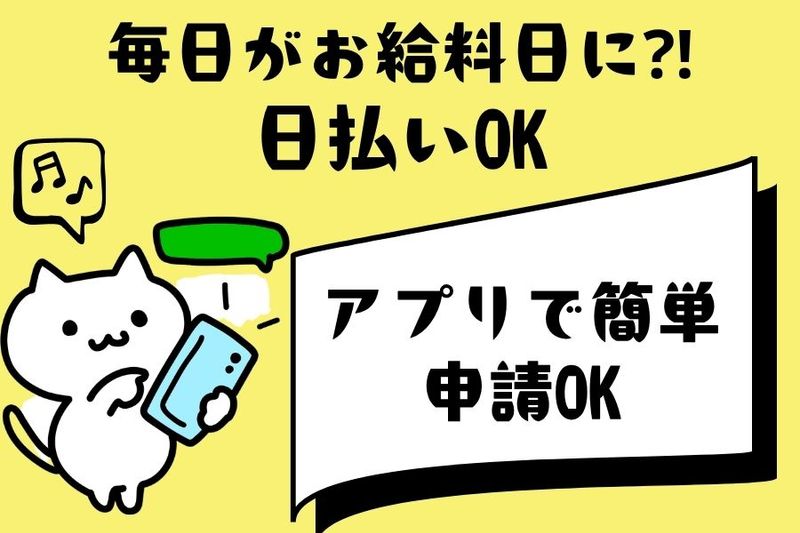 アピールポイント: /\/\/\/\/\/\/\/\/\ 入社時の特別支給「サクッと1万」開始 \/\/\/\/\/\/\/\/\/ 入社初日に「入社特典」をゲットしよう! 配属されたその場で「現金1万円!」 気になったらお気軽にお問い合わせください! 正社員登用の可能性ありでモチベアップ! ・未経験OK ・日勤のみ ・初日から時給1600円 ・正社員登用の可能性あり ・残業無し可 ・男女活躍中 ・丁寧な研修あり ・車・バイク通勤OK ・気温に応じて空調服・防寒着貸与 ・作業服貸与 ・ウォーターサーバー利用可 ・髪色ゆるめ ・ネイルOK(手袋着用) ・アクセサリーOK <日払い・週払い利用OK> \まるで毎日が給料日/ \\利用者急増中// \アプリで簡単申請/ お気軽にご相談くださいね!