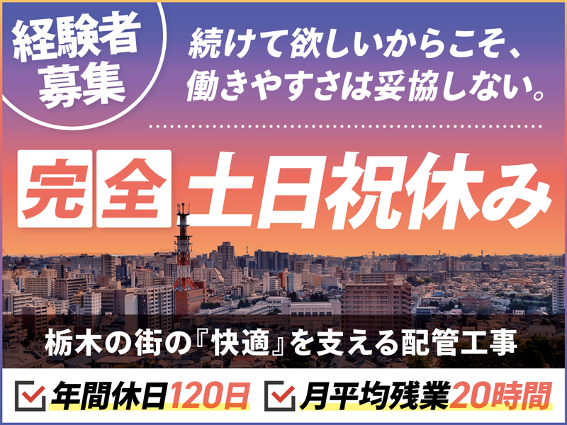 仕事内容 <施工管理・現場監督の経験者を募集> <家庭も大事にしながら働くパパ多数> 〇完全土日祝休み・月残業平均20h 〇公共工事+メーカーからの依頼多数 〇栃木市の指定工事店 管工事施工管理技士などの 『資格取得支援制度』や 奨学金返還をサポートする 『奨学金返還支援制度』あり! 「これまで培ってきたノウハウをもとに 新しい環境で資格を活かしたい!」 「10年後には独立したい!」 そんな熱い想いをサポートします。 =================== 【 仕事内容 】 新築建物の給排水設備、空調設備、 衛生設備、ガス配管工事、公共設備 (水道施設工事、管工事、土木工事) における現場管理、工程管理、資材管理、 安全管理などをお任せ。 [施工期間] 半年~1年※基本的に1現場ずつ対応 [1日の流れ] (1)8時/会社へ出社 (2)準備して現場へ (3)現場作業 (4)17時/退社 ※会社から現場までの移動時間も 勤務時間内に含んでいます。 ※移動は社用車を使用します。(普通乗用車) [現場] 県南を中心に宇都宮市、鹿沼市方面。 会社から車で30分~1時間の範囲です。 一戸建てやマンション等の一般住宅から 店舗やオフィス、工場などの工事まで 幅広く請け負っています。 経験豊富なスタッフが多く、 チームワークを大切にしている職場です。 すぐにサポートしあう雰囲気のなか、 安心して働けます! [施工事例] ・空調化工事 ・給湯省エネ 電気給湯器交換工事 ・クリニック新築工事(埼玉県) ・合併浄化槽布設工事(小山市) ・エアコン改修(リニューアル)工事(壬生町) ・高校トイレ改修工事(栃木市) ・小学校給食センター新築機械設備工事 (栃木市) =================== 【 会社紹介~業績安定企業です~ 】 普段何気なくひねる蛇口、 季節問わず快適に過ごせる空調、 安心して走れる道路など 生活に身近な場所の工事を行う当社。 平成2年4月創業以来、順調に業績を伸ばし 『年間4億円』の売上を計上しています! <会社ホームページ> https://www.yamasetsu.jp/