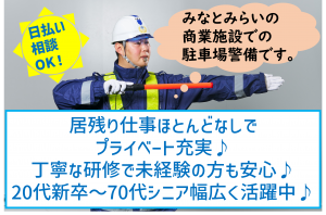 募集背景 増員に伴う募集です! ★期間強化求人★ 仕事内容 <お仕事内容> 横浜市西区みなとみらいにある商業施設での 駐車場警備業務です。 具体的には・・・ ■お客様や搬入車両の案内・誘導 ■歩行者のお客様への案内・誘導・お声がけ など 業務変更範囲:なし ☆転勤なし!地元で長くお仕事ができます♪ ☆1日のお仕事のモデルをご紹介 ■07:30~08:00 現場到着!お仕事の準備をします ■08:00~12:00 警備実務!足休めや水分補給の時間があります ■12:00~13:00 昼食休憩!控室でご飯が食べられます ■13:00~18:00 警備実務!足休めや水分補給の時間があります ■18:00 業務終了!後片付けをして退勤します [醍醐味] 〇屋外でのお仕事がメイン! 〇適度に体を動かしてお仕事できる! 〇お客様に丁寧な対応をするのが楽しい♪ 〇「この施設を守っている」という責任感♪ 〇数値ノルマがないのでのびのび働ける♪ [厳しさ] 〇大切な施設・建物を守るという責任感が必要 〇仕事に真面目に取り組む気持ちが必要 〇仕事に遅刻しない生活習慣が必要 [こんな人が活躍] 〇安定した職場で仕事をスタートしたい方 性別・経験を問わず活躍できます! 正社員・契約社員・パート・アルバイト・スキマバイトと 様々な方が当社で活躍中です! 〇警備員・警備経験者の方 配置場所によっては専門知識が活かせます! 施設警備員・交通誘導警備員を問いません! 〇異業種からの転職者の方 販売・接客・店長・ホテル・フロント・工場・軽作業・土木・建築等のお仕事経験を活かして お客様対応をしている方もいます♪ 〇ミドル・社会人経験豊富な方 40代~50代の方が活躍中です♪ もちろん新卒・第二新卒の方も多数います♪ 〇夢を追いかけている方 ミュージシャンやクリエイターなどを目指しているけど副業で収入源は欲しい! という方もいらっしゃいます!