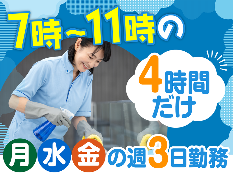 仕事内容 / 60~70代のシニア世代が活躍中! 朝の時間を活かして、 1人でモクモク作業の清掃募集♪ \ ✅週3日・平日のみ ✅1日4時間勤務 ✅直行直帰OK ✅重たい荷物運びなどナシ ✅午前中のみ固定シフト ✅半年ごとに勤務曜日変更可能 \慣れれば3時間で終了!/ 早く終わっても時給は4時間分保証。 そのまま帰宅してOK! 出退勤時間も好きに決めてOK! 空き時間にサクッと働けて、 安定して稼げます◎ \半年ごとにシフト変更OK!/ 進級や授業の予定に合わせて 勤務曜日を変えられるから、 生活リズムに合わせて 無理なく続けられます。 【仕事内容】 オフィスビル内の清掃を 担当していただきます。 4F建の建物で、上り下りは エレベーター利用OK! 1人現場なので、自分のペースで 焦らずコツコツ進められます。 <具体的には…> ●共用部の床清掃(モップ掛け・掃き掃除) ●ゴミ回収・分別 ●トイレなど水回りの簡単な清掃 清掃の手順や道具の使い方は、 最初にマンツーマンで丁寧にレクチャー。 未経験から始めたスタッフも多く、 特別な知識や経験は必要ありません。 ━━━━━━━━━━━━━ こんな方にオススメです♪ ━━━━━━v━━━━━━ ・コツコツ作業が得意な方 ・定年退職後、体に無理なく働きたい方 ・授業前に働きたい大学生や専門学生など 短時間勤務×力仕事ナシ! 年齢に関係なく長く続けやすいです。 現在は、 ・授業前に働く大学生 ・体を動かしながら働きたい 60代・70代のシニア層 などが活躍中!