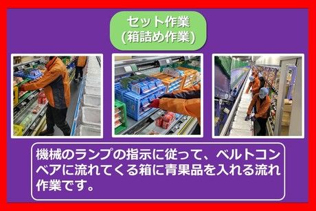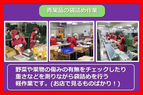仕事内容 【私たちが行っている作業は・・・】 物流センターの中で「生協の宅配」でご家庭へお届けする青果品(野菜や果物)の”袋詰めから箱詰め”迄行っています。 今回、野菜・果物の袋詰めやピッキングしたりする軽作業のお仕事を募集しています。 【募集しているお仕事の具体的な内容は・・・】 ◆「青果品の袋詰め作業」 ┗野菜や果物を袋に詰めていく軽作業です。(スーパーなどで見かける青果品の袋詰めを作ります) ◆「青果品のピッキング作業」 ┗機械のランプの指示に従って、ベルトコンベアに流れてくる箱に青果品を入れる流れ作業です。 *40cm四方の発砲スチロールの箱に青果品を箱詰めして出荷します ◆「入出荷作業」*フォークリフト免許が無くてもOKです ┗トラックで入荷する青果品の数量確認や検品等を行い、種類別に分けていく作業です。 ┗(フォークリフト免許をお持ちの方は)フォークリフトを使用し、商品の移動等を行います。 【お仕事の1日の流れは・・・こんな感じです】 *9:00~18:00勤務 「青果物の袋詰め作業」+「青果品のピッキング作業」の場合 9:00 朝礼開始 9:10 「青果品の袋詰め作業」開始 12:00 お昼休憩 12:45 作業再開 14:45 「青果品の袋詰め作業」終了、 休憩 15:00 「青果品のピッキング作業」開始 18:00 勤務終了 【職場環境は・・・】 野菜や果物を扱うので作業場の室温は室内空調により15度前後です。なので、夏は涼しく冬は暖かい快適な仕事場です。 *常温倉庫ではないので、身体のことを考えると冬場や夏場は特に大切なポイントですよ! 【ここがポイント】 ◆事業拡大の為、パートさん大募集!幅広い年齢の方、Wワークの方が活躍出来るお仕事! ◆週2日から週5日迄勤務可能。勤務時間、曜日が選べる! *朝から、午後から、夕方から、22:00~ *半日、フルタイム ◆未経験で始めた方が多い職場です ◆福利厚生として内部販売制度があります! ◆社員食堂あります! ◆お子様の学校行事のお休みOK! ◆髪色・髪型・ネイル自由! ◆フォークリフト免許をお持ちの方も募集中! ◆物流大手の安定した会社です(東証プライム上場企業) *「SBSゼンツウ」で検索 ◆車、バイク、自転車通勤可能!(駐車場完備)