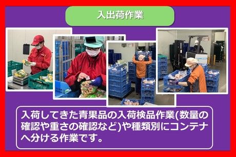 勤務時間 *勤務曜日: 固定曜日での勤務(勤務曜日は面接時にご相談) (勤務曜日が祝日の場合:お休みでは無く、勤務日となります) *繁忙期は残業が発生する場合があります。 ◆「青果物の袋詰め作業」+「青果品のピッキング作業」 1.9:00~18:00(休憩60分)/時給 1,110円 ・日曜~木曜の週5日勤務限定 ・9:00~14:45迄「青果物の袋詰め作業」、15:00~18:00迄「青果品のピッキング作業」となります。 ◆「昼間入出荷作業」 2.8:00~17:00 (休憩60分)/時給 1,110円 ・日曜~木曜の週5日勤務限定 ・フォークリフト免許所持の方は時給1,200円 ◆「夜間入出荷作業」 3.22:00~翌7:00(休憩60分)/時給1,110円+深夜手当 1,388円 ・土曜~水曜の週5日勤務限定 ・フォークリフト免許所持の方は時給1,200円+深夜手当1,500円 ◆「青果品のピッキング作業」 4.13:00~22:00(休憩60分)/時給 1,110円 ・日曜~木曜の週5日勤務限定 5.17:00~21:30(休憩15分)/時給 1,110円 ・日曜~木曜の間で週2~5日勤務(応相談) 6.18:00~22:00(休憩15分)/時給 1,110円 ・日曜~木曜の間で週2~5日勤務(応相談)