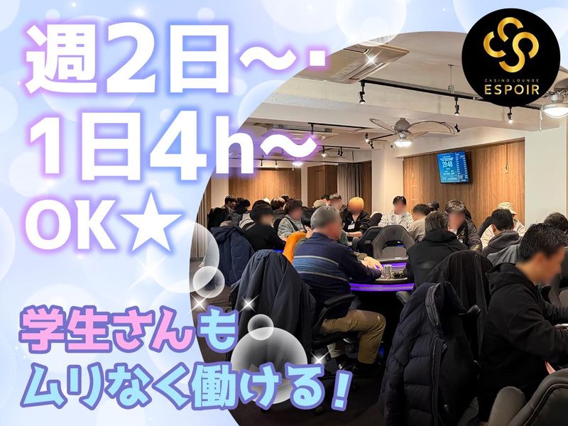 仕事内容 「ポーカー×おしゃれ空間」 ちょっと特別なバイト、始めてみませんか?🃏✨ 落ち着いたラウンジで、 お酒や会話を楽しみながら働けるお仕事です♪ ◆◇女の子に人気の理由はこちら◇◆  ̄ ̄ ̄ ̄ ̄ ̄ ̄ ̄ ̄ ̄ ̄ ̄ ̄ ̄ ̄ ̄ ̄ 💰 しっかり稼げる → 時給1,800円も可能+ドリンクバックあり♪ 💅 おしゃれ完全自由 → 髪色・ネイル・ピアスぜんぶOK♡ 🕒 シフト超柔軟 → 週2/4h~OK&終電考慮◎ 🎮 レアバイト体験 → ポーカー未経験でもOK!研修あり♪ ◆◇お仕事内容◇◆  ̄ ̄ ̄ ̄ ̄ ̄ ̄ ̄ ̄ ◆ ディーラー業務 ポーカーのカード配布や進行サポート♪ ルールはイチから教えるので、 「ポーカー知らない…」という方も安心です◎ ◆ ホール・フロア業務 受付やドリンク提供などのシンプルな接客♪ お客様との会話を楽しみながら働けます! 💡 ドリンクバックあり♪ ドリンク注文ごとにバック支給◎ 「楽しみながら稼げる」のがポイントです♡ ◆◇未経験でも安心◇◆  ̄ ̄ ̄ ̄ ̄ ̄ ̄ ̄ ̄ ̄ ̄ ほとんどのスタッフが未経験スタート! 接客やポーカーが初めてでも大丈夫◎ 先輩スタッフが仕事の流れや接客のコツを、イチから丁寧にお教えします♪ オープンしたばかりの店舗ですが、 すでに先輩メンバーも在籍しているので、困った時もすぐに相談できます! ※店内が電子タバコ喫煙可能店舗のため、 健康増進法に基づき20歳未満の方はご応募いただけません。 ◆◇店舗について◇◆  ̄ ̄ ̄ ̄ ̄ ̄ ̄ ̄ ̄ ̄ 母体は、国内外で飲食店を展開する安定企業。 その新規事業として誕生したのが 「CASINO LOUNGE ESPOIR」です✨ 木目調の落ち着いた店内で、 お酒とポーカーを気軽に楽しめる空間♪ 椅子はゲーミングチェア仕様で座り心地も抜群◎ 「また来たい」と思ってもらえる 居心地のいい遊び場を目指しています♡