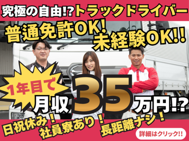 アピールメッセージ ✨入社祝金20万円✅未経験OK✅1年目月収35万円可✅日祝休み✅16時退社で夜勤なし ドライバー必見!年賞与2回、免許取得支援や給与加算制度が充実。大手物流企業で新キャリアを始めませんか?<未経験歓迎>