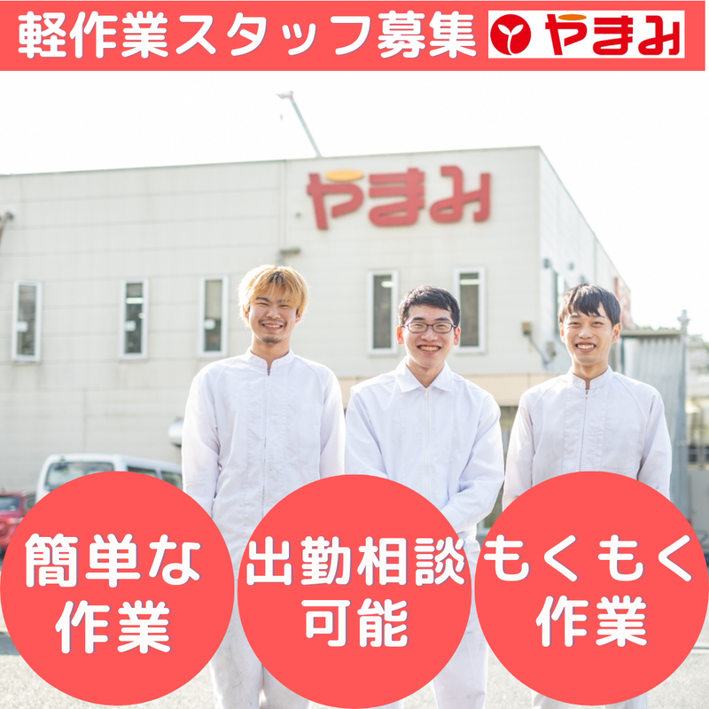 仕事内容 食品工場での軽作業スタッフとして募集! 丁寧な研修とマニュアルをご用意しています。 また、適性に応じてあなたにあったお仕事をご案内いたしますので、 仕事内容や勤務時間などお気軽にご相談ください。 -------------------- ⭐働きやすさのそのワケは・・・・ -------------------- ✅ 未経験歓迎:特別なスキルや経験は不要!丁寧に教えます ✅ 週3日〜OK:勤務日数や時間は相談可能。扶養内勤務もOK ✅ 安定企業で安心:豆腐業界で唯一の東証上場企業 ✅ 勤務時間相談可:お子さんや家庭の都合などお気軽にご相談ください! ✅ 入社祝金あり:アルバイト・パートでも5万円もらえます! -------------------- このように働きやすい条件が充実✨ アナタもぜひ挑戦してみませんか♪ -------------------- 【具体的には】 下記業務を適性に応じて行って頂きます。 最初は掃除から...、慣れてきたら検品..など様々です! ・製品の検品 ・出荷ケースへの製品の箱詰め ・生産実績の記帳 ・ラインの清掃作業 -------------------- 【よくあるご質問(Q&A)】 Q. 清掃の仕事が初めてでも大丈夫ですか? A. はい、まったく問題ありません! これまでに事務や販売、接客などの経験がある方も多数活躍中です。 特別な資格や経験は不要で、未経験からスタートしたスタッフが多数在籍しています。 丁寧なサポート体制があるので、安心してご応募ください。 Q. 勤務時間はどのように決まりますか?相談できますか? A. 勤務時間はご希望に応じて柔軟に調整可能です。 たとえば… ・子育て中の方 →「9:00〜13:30」でお迎えに間に合うように ・Wワーク希望の方 →「8:00〜12:00」で午後の仕事と両立 ・フルタイム希望の方 →「8:00〜15:00」でしっかり勤務 ・など、ライフスタイルに合わせて働けます。お気軽にご相談ください! -------------------- 【社員インタビュー】 <30代・女性/子育て中・未経験スタート> 「子どもが小学生になったタイミングで、 午前中だけ働ける仕事を探していました。 やまみでは9:30〜14:00の時間帯で働けるので、 子どものお迎えにも間に合いますし、 急な学校行事にも柔軟に対応してもらえます。 清掃の仕事は初めてでしたが、丁寧に教えてもらえて安心でした!」 <40代・男性/Wワーク希望> 「午後から別の仕事があるので、午前中だけ働ける職場を探していました。 やまみでは勤務時間の相談ができるので、8:00〜12:00で働いています。 体を動かす仕事なので健康にも良く、Wワークでも無理なく続けられています。」 -------------------- 【やまみの魅力とは?】 ・安定した食品業界での上場企業 ・未経験でも安心して働ける環境 ・地域密着で長く働ける職場 ・清掃業務で社会貢献を実感できる 【やまみをひと言でいうと?】 ・業界を代表する豆腐メーカー。 ・営業としても働きやすい企業。 ・家庭との時間を大切にできる職場。 ・上場企業として安定性がある。 ・明るく自由な社風が魅力の職場。