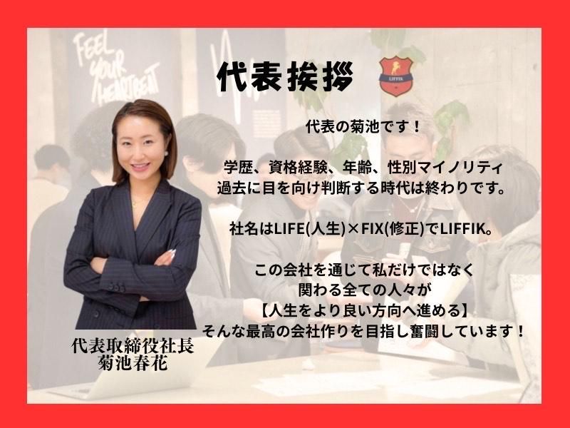 選考プロセス 【選考プロセス】 [1] Web応募書類による書類選考 ※結果は合否に関わらずご連絡します。 ▼ [2] 電話面接 ▼ [3] 会社見学&最終面接 ▼ [4] 内定 ※ご応募から内定までは1〜2週間を 予定しています。 ※面接日、入社日はご相談に応じます。 【応募方法】 応募フォームからご応募ください。 「過去は変えられないけど、未来は変えられる」 LIFFIKは、あなたの「これから」に期待します。 学歴や経験で諦めていた方、 ぜひ一度、お話してみませんか? ご応募をお待ちしています!
