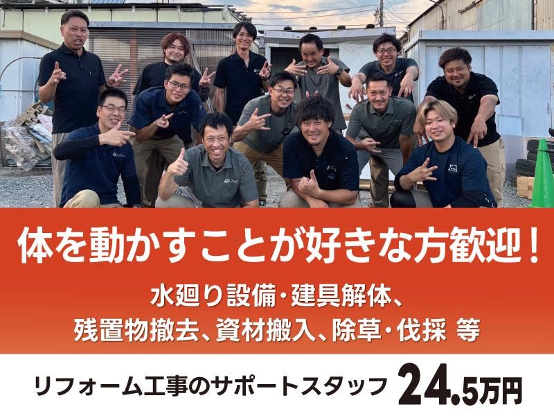 求めている人材 【必須】要普通免許(AT限定可) <未経験者歓迎!簡単作業で安心> ・学歴不問!年齢不問!経験不問! 未経験でも安心の簡単作業! ・実際に業界未経験スタートの人も 複数入社しています! ・道具の名前、使い方から しっかりレクチャーします。 ・施主不在の空き家の工事が多いので、 人目を気にせず質問もしやすく、 先輩からのサポート体制もバッチリ! ========== < こんな方歓迎 > ========== ・DIYに興味がある人 ・リフォーム動画が好きな人 ・デスクワークよりも 体を動かしながら働きたい方 ------------------ "リフォーム業"や"職人"といった仕事に 興味はあるけど不器用だから自信がない... そんな方にもオススメ! まずはサポートスタッフに挑戦して、 少しずつ慣れていきませんか?