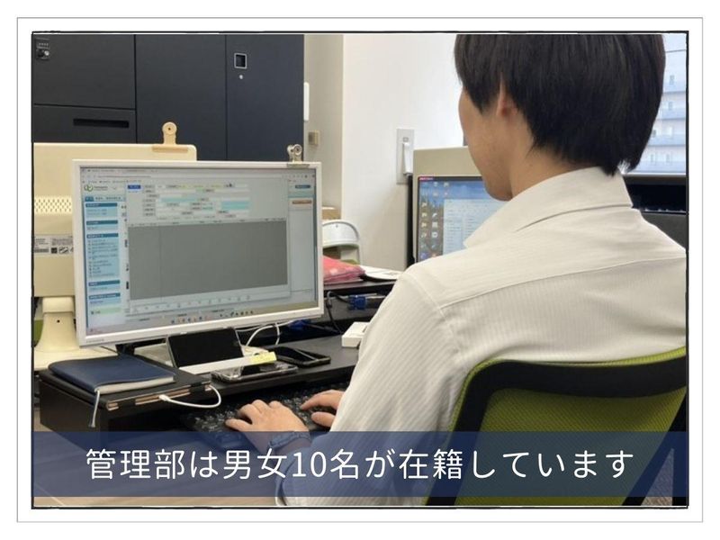 職場環境 管理部は、現在10名(男性2名、女性8名)、20代~30代スタッフが在籍しています。 社内の“縁の下の力持ち”として活躍していただけるポジション。 普段は和やかに会話や笑いもありながら、 集中すべき時にはしっかりと取り組む、メリハリのある職場環境です。