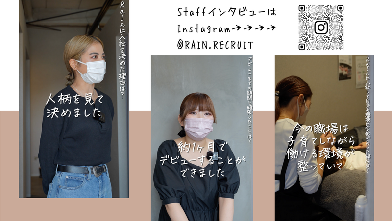 求めている人材 【必須資格】 ・美容師免許 ●「美容の仕事がしたい」という思いを持つ方: 未経験の方はもちろん、資格はあっても経験の浅い方、ブランクのある方でも、美容に対する思いがある方であれば大歓迎です。 ●学ぶ意欲を持つ方: 当店では常に最新のトレンドや技術を追求し、お客様に最高のサービスを提供することを目指しています。そのため、新しいことを学び、自身のスキルを磨く意欲を持つ方を求めています。 ★先輩スタッフからの一言★ Rainは全てのお客様に「こんなサロンを探してた!」と思っていただけるアイブロウサロンを目指しています。 私自身サロンに行った際に、「こんなはずじゃなかったのに…」「思ってることをうまく伝えられない」「なんか気を使うな」そう思うことがありました。 今よりも素敵な自分になって、今よりも少し自信が持てる。美容にはそんな力があると信じています。 Rainはそんな思いを形にできるよう、働きやすい環境創り、研修制度でバックアップしてくれるサロンなので、経験者の方はもちろん、資格はあっても経験の浅い方、未経験の方、ブランクのある方でも美容に対する思いがある方であれば自信を持ってオススメできます! 一緒に"お客様の笑顔"を求め続けるサロンを創っていきましょう♪ ★職場の雰囲気★ 働くスタッフは「美容が大好き!」「お客様に喜んでいただきたい!」という思いの人ばかりです♪ 技術の相談や練習はもちろん、トレンドのメイクやコスメについての会話も頻繁に行われています^ ^ お互いを尊重し助け合う社風ですので、初心者やブランクのある方でもすぐに馴染め、安心して働ける環境です♪ ちなみに、Rainでは一人一人の個性をとても大切にしているので、"制服"がありません♪ 仕事の話だけでなく、メイクやファッションやイベント、オススメのカフェやランチなどなど、いつも色々と楽しく共有しています^ ^ ★どんな人が活躍しているか★ お客様の笑顔のために継続的に努力できる人が活躍しています。 ご予約メニューを黙々と"こなす"のではなく、お目元はもちろん、お客様の理想のイメージや、ファッション、ライフスタイル全体からプロとして"提案すること"を大切にしています♪