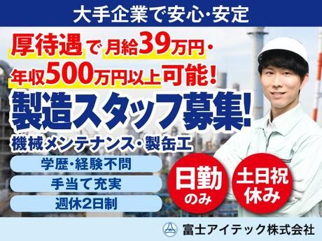 仕事内容 機械据付、鋼構組立製作のお仕事です。 <具体的な仕事内容> 設備の補修・建設工事を施工するお仕事です。 グループ(3~4人)毎での行動がメインとなります。 チームワークを大切にしながら、 互いに助け合い、支え合う現場です。 仕事は全く未経験からでも始められます♪ 最初の3ヶ月は先輩社員と一緒に 構内を廻りながら設備のメンテナンスをしたり、 補修の依頼があれば 共に行動しながら仕事を覚えていきます。 試用期間後も基本グループで行動しますので すぐに慣れなくても安心ですよ(*^_^*) 無資格の方は仕事しながら 資格取得も目指せるので (取得費用は会社負担) 全くの異業種からでもできるお仕事ですよ♪ 会社見学や、質問など、 少しでも気になった方はご応募くださいね! 【当社の魅力】 ◎完全土日祝休み(福山勤務の際) ◎年間休日126日でプライベートも充実! ◎大手企業で安心・安定 ◎未経験からでもOK! ◎毎年昇給チャンスあり! 月給39万円・年収500万円以上可能! 福山ではJFEスチールの構内で機械メンテナンス・ 製缶工を中心に事業展開しており、 その他全国の設備・補修・建設工事を 施工するお仕事です。 若手とベテランがしっかりサポートし合っている 活気ある職場です! 今回は、 正社員の製造スタッフ(機械メンテナンス・製缶工) 〈就業場所:福山JFE構内〉を募集いたします。