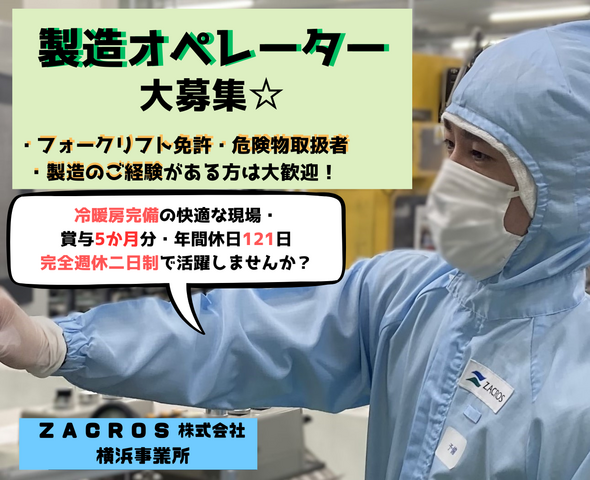 職種 製造オペレーター 雇用形態 職業紹介(正社員) 休日・休暇 ・完全週休2日制(土・日・その他会社カレンダーに準ずる) ・年間休日121日 ・慶弔休暇 ・育児休暇 ・介護休暇 ・看護休暇 ・夏季休暇 ・GW休暇 ・産前産後休暇 ・年末年始休暇 ・有給休暇 (入社月に3日先行付与/6カ月後に残り7日付与) 福利厚生・待遇 ・健康保険 ・厚生年金 ・雇用保険 ・労災保険 ・財形貯蓄 ・通勤手当 ・役職手当 ・社員持株 ・社内貸付金 ・時間外手当 ・交代勤務手当 ・確定拠出型年金制度 ・昇給あり(年1回) ・賞与あり(年2回/前年度実績5.16ヶ月分) ・退職金あり(勤続2年以上) ・再雇用制度あり(上限65歳まで) ・社宅あり(単身:1R 負担7千円/世帯:2DK 最大負担1万3千円) \ その他、こんな制度もご用意♪ / ・カフェテリア制度(3万円/年) └医療費、資格取得、参考書、食事補助等、年3万円まで自由に使える! ・行事(納涼祭、納会/※参加自由・会社負担) ・部活動あり ・教育制度(年4回) └安全対策、ビジネスマナー、環境と品質など 従業員の声「ZACROSの魅力」 \この仕事、実は「自分の時間」を大切にできます/ ZACROSの製造オペレーターは1週間ごとの交替勤務制。 勤務時間があらかじめ決まっているため、 ★平日昼間に役所・病院・買い物ができる ★朝活・ジム・サーフィン・趣味の時間を確保できる ★ ラッシュを避けて通勤でき、体力的な負担も少ない など、生活リズムをコントロールしやすい働き方が可能です。 さらに勤務地は【横浜市・駅徒歩5分】。 仕事終わりにそのまま横浜・みなとみらい方面へ出かけたり、 「アフターファイブ(アフターワーク)」をしっかり楽しめる立地も大きな魅力です。 ■ここが現場の強み ・冷暖房完備の快適な製造環境 └「暑さ・寒さが厳しい現場はもう卒業したい」という方に最適! ・国内トップクラスの安全・品質基準 └ムリ・ムダのない生産体制で、落ち着いて働ける職場 ・経験・スキルを正当に評価するキャリア制度 └実力に応じて班長・係長へステップアップ可能 【スタッフの声】 「プラスチック廃棄物の環境問題に対して大きな意義があり、やりがいがある」 「新製品の研究開発や新規事業の開拓など、未来に向けたチャレンジに対して積極的に投資を行っている点」 「仕事等で困っていると、周囲の人が積極的に助けてくれる」 「男性の育児にも協力的で、育児休暇を取得できた」 「時間の使い方が上手くなり、趣味の時間が増えた」 「交替勤務だけど、むしろ生活が整った」 「都心に近く、仕事終わりも充実している」 暑さ・寒さにサヨナラ!快適な環境で実力を発揮しキャリアアップ☆ 真夏の蒸し暑さ、真冬の底冷え、そんな過酷な環境で頑張ってきた方にこそ選んでほしい職場です! ZACROSの製造現場は冷暖房完備で、年間を通して快適な温度をキープ。汗だくになったり、寒さで手がかじかむような心配はありません。 だからこそ、ものづくりに集中できる環境があります。 設備も整っていて、安全面や作業効率にも配慮。 現場経験を積んだ方ならすぐに違いを感じていただけるはずです。 快適さとやりがい、どちらも妥協せずに働ける職場で あなたの技術を存分に発揮してみませんか?