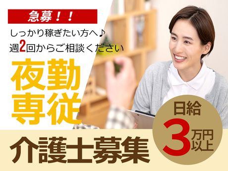 仕事内容 ■特別養護老人ホームにおける夜勤専従介護業務全般 ・食事配膳、下膳等食事介助 ・トイレの誘導、衣類の着脱等排泄の介助 ・環境整備 ・ナイトケア、モーニングケア ・夜間時の安否確認 ・介護記録作成 など <派遣先> 全120床特別養護老人ホーム ※4人部屋 :30室 <通勤方法・その他補足> ※自転車、バイク通勤OK ※車通勤についてはご相談ください <新型コロナウイルス感染防止対策実施> マスク着用での勤務、アルコール消毒液完備などの感染対策をし、利用者様もスタッフも守れるよう体制を整えています。 <受動喫煙対策> あり(屋内禁煙) ここがポイント ■日給3万250~3万1800円 ■16:45~翌10:15(実働15時間30分)勤務 ■週2回勤務よりご相談ください ■最寄駅より徒歩6分!駅チカで通勤便利 ■自転車、バイク通勤OK ■車通勤についてはご相談ください ■他にも「日給3万円以上」の求人多数!お問合せください☆
