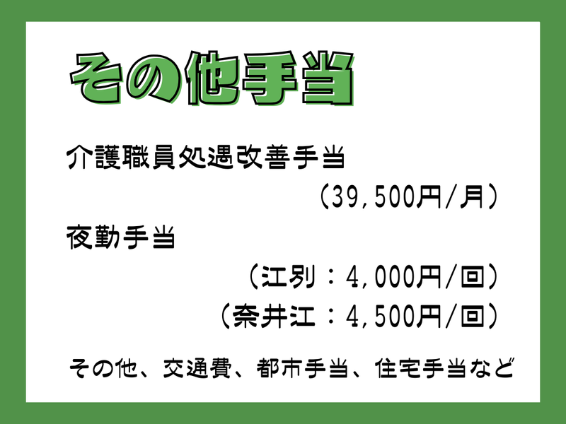 仕事内容 介護サービスを利用する高齢者等に対し、一人一人に合わせた「生活」の支援を行っていただきます。 寝て、起きて、身支度をして食事をして、好きなことをして過ごし、お風呂に入って夜はぐっすり眠る‥といった「ごくふつう」の暮らし。 その暮らしの中の様々な場面で一人では難のある部分について、どのようにすると利用者が出来るようになるかを多職種と連携しながら実践し支えていくお仕事です。 ⭐ この求人のポイント ⭐ ✅ 残業月10h以内&保育所完備で働きやすさ抜群 ✅ 未経験OK!資格取得を法人が全面バックアップ ✅ 科学的根拠に基づいたケアでスキルアップ ✅ 「人柄採用」だから人間関係が良く定着率◎ ⏰ 新入社員一日の流れ(介護職の場合) ⏰ 09:00~ 出勤・申し送り・水分補給介助 10:00~ 入浴介助・リハビリのサポート 12:00~ 昼食介助・口腔ケア・休憩 14:00~ レクリエーション・おやつ 16:00~ 記録作成・夕食準備 18:00 退勤 (※シフトにより異なります) ✨ 事業の強み ✨ 「高齢者が住民とふれあいながら医療や介護を受けられる拠点」 という国の構想を具現化しました。 予防介護から看取りまで 全てのニーズに対応できる環境と 地域との繋がりが最大の強みです。 ✨ 働く環境 ✨ 業界最高レベルの環境整備を推進中! ✅ 残業は月10時間以内 ✅ 産休育休・時短勤務の整備 ✅ 敷地内保育所あり ✅ 2段構えの充実した退職金制度 女性も長く安心して働ける職場です。 ✨ 仕事内容の魅力 ✨ 専門職が常駐しフラットな関係で連携しています。 「なぜこのケアが必要か?」を科学的根拠に基づいて学べるため未経験の方も、経験者の方も確かなスキルと自信が身につきます。 ✨ 応募歓迎メッセージ ✨ 「介護の仕事は好きだけど人間関係や待遇で悩みたくない」そんな方にこそ来てほしい職場です。 人柄重視の採用を行っているためスタッフは皆、協調性があり穏やか。 まずは見学だけでも大歓迎です!