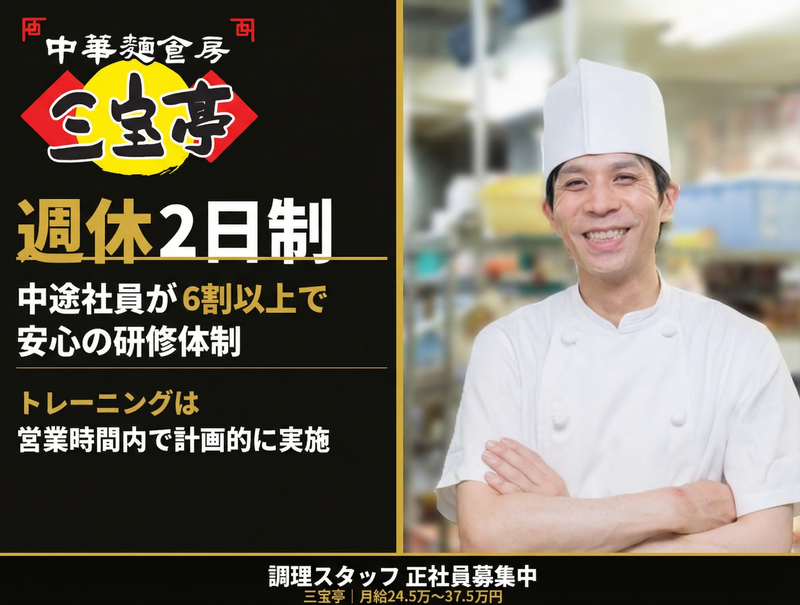 仕事内容 \“ただの食事”じゃない一杯をつくる仕事/ 「また来たい」 「また食べたい」 そう思っていただける一杯を、 一緒に届けていきませんか? スープ・麺・盛り付け・スピード。 一つひとつにこだわるからこそ、 調理の面白さと奥深さを実感できます。 未経験の方でも大丈夫。 基礎から順番に覚えていけるため、 包丁をほとんど使ったことがない方も活躍中です。 【この求人のポイント】 ✅ 未経験からスタート可能(教育体制あり) ✅ 賞与年3回+昇給ありで安定収入 ✅ 週休2日制で無理なく働ける 【会社について】 三宝は創業から50年以上続く、安定した経営基盤を持つ飲食企業です。 長年にわたり地域に愛される店舗づくりを続けています。 【会社の強み】 ・長年続く安定した経営 ・未経験者を育てる教育文化 ・中途入社が多く馴染みやすい環境 ・評価制度が明確で昇給・賞与に反映 【募集背景】 店舗体制の強化に伴い、新たなメンバーを募集しています。 【仕事内容】 ラーメン店での調理業務全般 【具体的には】 ・食材の仕込み、下ごしらえ ・ラーメンや炒飯などの調理 ・盛り付け、提供準備 ・洗い場業務 ・厨房内の清掃 将来的には、 ・発注や在庫管理 ・スタッフ管理 ・売上管理 など店舗運営にも携わることが可能です。