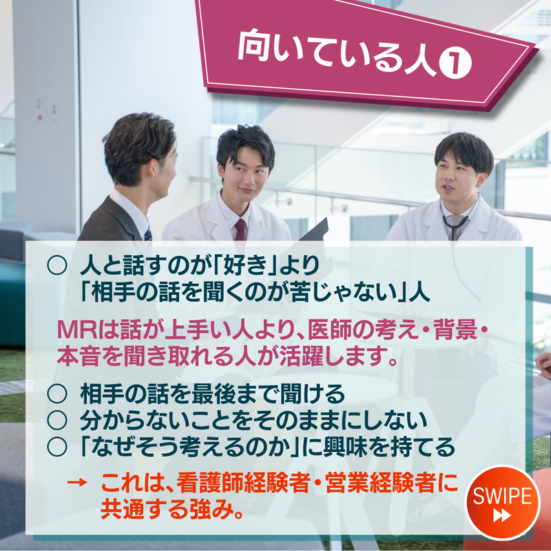 仕事内容 助産師として活躍する20代・30代の "未経験を対象とした、 未経験MRの募集です。 「学習への不安」や「業界ルールへの懸念」 を払拭する万全のサポート体制で、 あなたをプロフェッショナルへと育成します。 【この求人の特徴】 ★グローバル展開国数: 世界【約110】カ国、圧倒的な事業基盤 ★「勉強についていけるか不安」を 解消する、期間中の給与全額保証 ★業界特有の「公正競争規約」により、 接待・過度な付き合いは一切なし ★年間休日122日以上、 残業月平均【20】時間未満 ★新薬立ち上げ(ローンチ)に 関わるチャンスが【非常に多い】 ★入社3年目で年収600万円以上も可能 (年収UPを実現) ★充実の研修(約2ヶ月・320時間) ✅《具体的な業務内容》 製薬企業のパートナーとして、 担当する医薬品や医療機器の 適正使用情報を医療機関 (病院、クリニック)へ提供し、 普及させる活動を行います。 <担当領域(例)> 配属は適性や希望を考慮します。 ・オンコロジー(がん) ・糖尿病、循環器 ・呼吸器、自己免疫疾患 ・バイオ医薬品 ・医療機器(SR) など <主な訪問先> ・大学病院、基幹病院、クリニックの医師 ・薬剤師、看護師、医薬品卸など <1日の業務内訳(目安)> ・医療機関への訪問・情報提供:約60% ・訪問準備、学習(製品知識、論文読解): 約30% ・日報作成、社内ミーティング、事務作業: 約10% ※原則、直行直帰の営業スタイルです。 (配属先企業による) ※社用車(AT)を貸与します。 【アピールポイント】 ✅【膨大な知識学習への不安】▶ 「業務」として学びます 「ゼロから医学なんて無理…」 と思っていませんか? 入社後の導入研修(約【2】ヶ月)は、 仕事=学習です。 独学ではなく、プロの講師が カリキュラムに沿って教えます。 もちろん、この期間も給与は全額支給。 生活の心配なく、学ぶことだけに 集中できる環境を用意しています。 ✅【MR認定試験のプレッシャー】▶ 「合格させる」ノウハウがあります 私たちは「未経験者を合格させるプロ」 でもあります。 文系出身者も多数合格しており、 模擬試験や徹底した対策講座で、 あなたを合格ラインまで引き上げます。 ✅《転勤・勤務地に関する不安について》 現在の居住地+住んでみたい・働いてみたい 5都道府県を共有いただきます。 私たちは個人の事情を 最大限尊重することを約束します。 その後の異動についても、 年1回のキャリア面談などを通じて 本人の意向やライフイベント (結婚、出産、介護など)を 十分にヒアリングした上で決定します。 不安な点は、面接の場で 遠慮なくご相談ください。 ✅《万全の研修体制》→MRのお作法 入社後は約2ヶ月(320時間)の 手厚い導入研修をご用意。 膨大な医薬品知識や医療制度はもちろん、 PCスキル(Excel, PowerPoint)や、 MRのお作法・業界知識・常識部分を 専任講師がゼロから丁寧に指導します。 配属後も、上長との週1回の面談や、 OJT同行(配属後1ヶ月は週2回程度)など、 チーム全体であなたをサポートします。