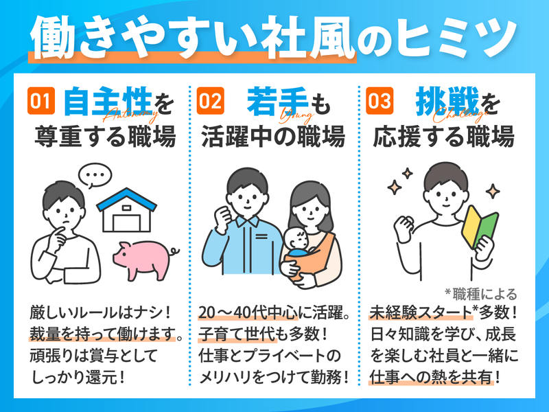 求めている人材 【必須項目】 ・建築士1級or2級有資格者 ・要普通自動車運転免許(AT限定可) ※木造建築の設計経験がなくても、 鉄骨・RC造建築の設計経験あれば応募歓迎 *20代・30代・40代活躍中! *転勤なし!UIターン歓迎 【こんな方のご応募をお待ちしてます】 「スケールの大きい仕事がしたい!」 「やりがいや仕事の意義を感じて働きたい」 「顧客や仲間と共に創る感覚が楽しい」 「多少責任を背負ったとしても 自由に仕事を進められる環境を重視する」 など 大学・大学院・専門学校などで建築士の資格 はとったが実務経験はないという方も歓迎!