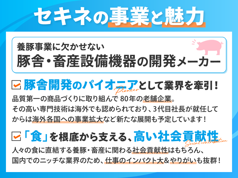 仕事内容 【『建築士1級・2級』の有資格者募集】 ==住宅設計などのスキルを活かせる!== 建築士の資格あれば実務経験年数不問◎ 完全フルオーダーメイドの豚舎づくりで 日本や世界の食を支える、スケールの 大きい仕事に挑戦しませんか? *デザインよりも、機能性に全振りした設計 *畜産農家のお客様と二人三脚でカタチに 《創業80年》業界シェアはトップクラス \\20代~40代が多数活躍中の職場// *完全土日祝休み、年間休日126日 *転勤なし!ライフイベントの計画も 立てやすい! ✅大規模建築物で木材の利用拡大 木造建築の需要増加!! ✅ご自分の市場価値UPの転職に◎ -------------------- This position requires Japanese Language Proficiency Test Level N1 or higher. 【仕事内容詳細】 木造豚舎の新築やリフォーム、 設備導入のための設計をお任せします。 ※設計ツール: AutoCAD、JwCADなど / 人にとって心地よい環境の建物づくりの ご経験があれば、畜産系の設計知識が 無くても、もちろんOK! \ お客様は、日本各地の畜産農家さん。 農家さんと二人三脚で、ブタにとっての 快適な家のイメージを形にしていきます。 ((例えば.... *ブタさんが水を飲みやすい高さは? *ブタさんがぶつかっても耐えられる柵 *子ブタさんが風邪を引かないよう 床暖を設置 など 養豚の教科書などをもとに、ブタの生態も 学びますが、基本は先輩同行のOJTを中心 にスタート。 施工管理や営業とも、密接にチームワーク を取りながら仕事を進めます。 *施工管理と共に建設現場の進捗確認 *営業がお客様に聞いて描いた図を基に製図 上記はもちろん ・施主との協議 ・許認可申請 ・基本設計、詳細設計 ・予算作成及び監理 ・資材発注及び業者手配 ・現場管理 など、活躍の場は多岐にわたります。 レアな業種のため、日本各地に現場あり。 〇自分の仕事のインパクトが目に見える〇 〇裁量権大きく、やりたいことを存分に〇 やりがい抜群!仕事の意義を確かに感じ、 ドライブ感を愉しみながら働きたい方に ぴったりな環境です。 ※木造設計の経験がなくても、 鉄骨・RC建築物の設計経験者は応募歓迎! <しっかり休める年間休日126日> 完全週休2日制の土日祝休みなので、 「週末は家族や友人と過ごしたい」 「子供の学校行事に参加したい」 ON・OFFメリハリつけた働き方が可能です◎ -------------------- 《 セキネについて 》 「セキネ」は創業80年。畜産資材の 開発、製造、販売、施工のパイオニア企業! 業界シェアはトップクラス! 知名度、信頼度ともに高く、 安定して働ける環境を整えています。 【セキネが目指すビジョン!】 セキネの強みはオーダーメイドの豚舎設備 と豚舎設計・建築。 メーカー機能を有し、設計から施工まで 一気通貫だからこその信頼と実績。 セキネの技術で *豚で人の命を救う時代をけん引する ドナー豚の施設づくりも挑戦 *日本の畜産業界の物価上昇、人材不足 の課題解決に挑む *世界に変革をもたらす マレーシアなどの海外プロジェクト 進行中!! など様々な分野で社会貢献をしていきます 【会社HPはこちら】 https://www.sekine-net.jp/