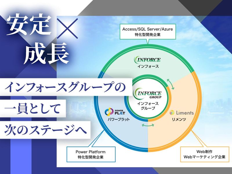 仕事内容 インフォースグループは、将来的なIPO(上場)も視野に入れながら、全社的に体制強化を進めています。 事業拡大に伴い、開発プロジェクトの数・規模が広がる中で、次の中核を担うPM候補(育成枠)を募集します。 今回のポジションは、いきなりPMをお任せする募集ではありません。 まずはプロジェクトの推進役として参画し、 「論点整理→選択肢提示→合意形成」の型を身につけながら、段階的にPM領域へステップアップしていただきます。 ★お任せすること(入社後の流れ) ━━━━━━━━━━━━━━━━━━━━ Step1:PLとして参画(状況把握・推進からスタート) ●顧客・社内関係者との調整、進捗管理、課題管理 ●要件定義・基本設計フェーズでの打ち合わせ同席/議事整理 ●開発メンバー(エンジニア/協力会社)との連携・段取り Step2:PM領域を段階的に担当 ●体制・スケジュール・コストの計画立案(上長と共同で設計) ●リスクの洗い出しと、対応方針の合意形成 ●品質観点の整理(レビュー設計、受入条件の明確化 など) Step3:PMとして独り立ち(裁量を広げる) ●案件全体の推進・意思決定支援 ●複数案件の並行管理(志向・経験に応じて) ※プロジェクト規模は数名〜十数名が中心。 ※「技術の細部までを一人で背負う」のではなく、チームと協力会社を束ねて前に進める役割です。 ★PM候補(育成枠)としての支援体制 ・まずは既存メンバーが伴走し、PMの判断軸・合意形成の進め方を共有 ・定例の振り返りで、課題整理・優先順位付けの型を言語化 ・役割範囲は経験に応じて調整 ★このポジションの特徴 ━━━━━━━━━━━━━━━━━━━━ 1)「PMになりたい」を現実にできる育成枠 大規模組織で役割が固定化し、PMの席が限られていた方でも、PL経験を活かしながらPMへ段階的に挑戦できます。 2)ワンストップ体制で“打ち手”が多い 情シス代行〜業務システム開発、インフラ、運用保守まで一括支援できるため、 PMとして関われる領域が広く、成長機会も豊富です。 3)これからのキャリア再設計を実現 年齢ではなく経験を評価。 これまでの現場推進力を、裁量ある立場で発揮したい方に合う環境です。