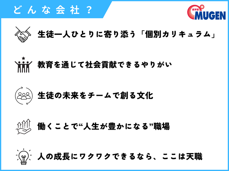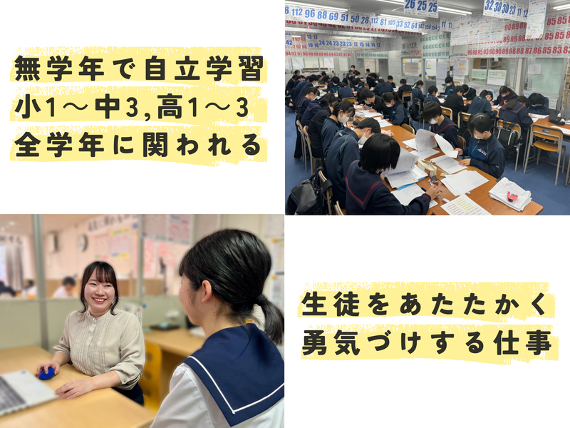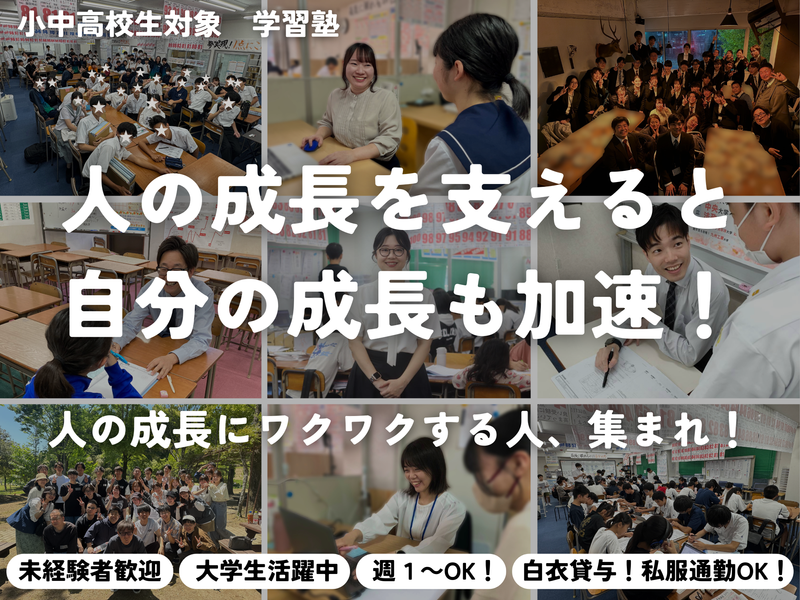 仕事内容 ・未経験者歓迎! ・週1日、1日2時間~勤務OK! ・シフト制で融通がききやすい! ✅授業スタイル ・個別カリキュラムで学習している生徒の学習サポート ・小学1年生~高校3年生が対象! ・指導教科は得意な2教科でOK! ✅充実の研修制度 座学だけでなく、先輩を生徒役に見立てた「教え方の練習(ロールプレイ)」からスタート。自信を持って生徒対応できるようサポートします! ✅「一人にしない」サポート体制 困ったことがあれば、先輩講師に相談できます! 生徒の学力もグングン伸ばしていますが、先生自身の成長も止まりません。 「人の成長に関わる仕事に興味があるし、自分も成長したい!」という人に向いています。 ✅「生徒のやる気を引き出すには?」といった悩みをその度解決できるため、着実にスキルアップを実感できます。 ✅将来に活かせる経験: リーダー業務への挑戦や、カリキュラム設計の補助など、就活やキャリアに活かせるステップアップも可能です。 ■ 生徒一人ひとりに寄り添う「個別カリキュラム」 MUGENの個別カリキュラムは、一般的な“質問対応”や“補習型”ではありません。 生徒は日々のPDCAを通して先を見て目標設定や振り返る力を身につけ、 先生は「伴走者」として学びを支え、寄り添いながらも引っ張り、フィードバックを返す仕組みです。 “教える塾”ではなく、“考える力と自走力を育てる塾”。 この学びの文化が、生徒の成長スピードを大きく高めています。 ■ 生徒の未来をチームで創る文化 生徒一人に複数の講師が関わり、 PDCAや声かけの方針を共有しながら前に進めていきます。 「自分一人で抱えない」「チーム全体で支える」という価値観が強く、 教育×チームワーク の働き方を体現できる塾です。