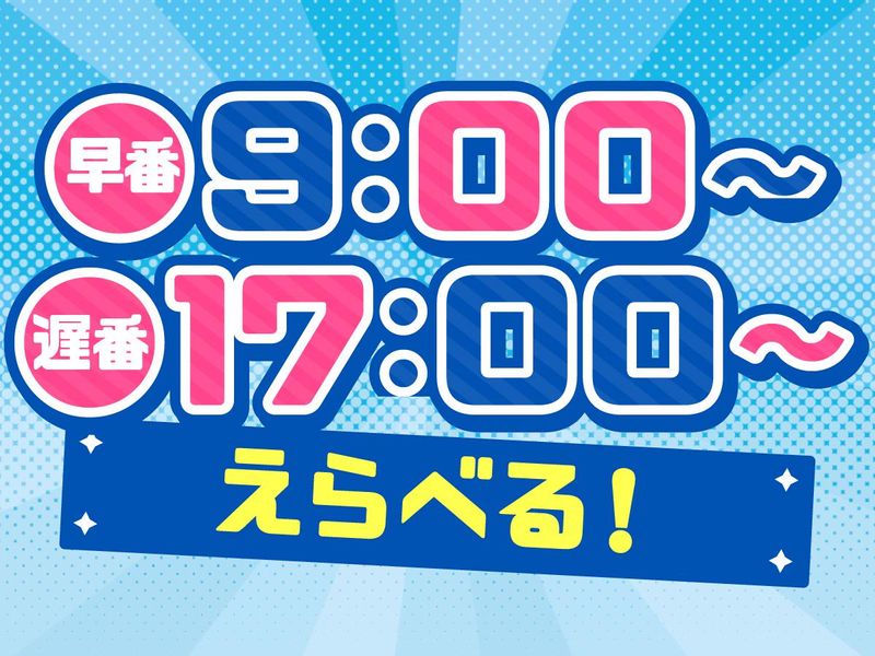 勤務時間詳細 <週2日~で働きやすい!> <シフトは2週間毎の自由シフト!> ・早番勤務(9:00~17:00) ・遅番勤務(17:00~23:30) どちらかのみの勤務OKです!