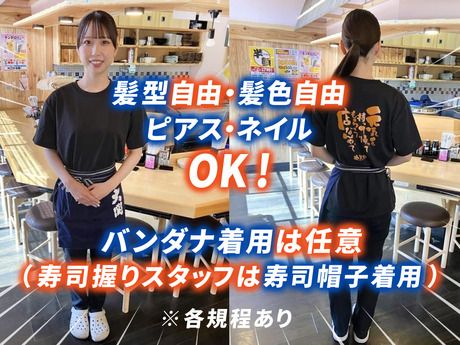 【保険制度】 雇用保険、労災保険、健康保険 待遇・福利厚生 【福利厚生】 社会保険(法定通り加入) 自転車・バイク・マイカー通勤OK(規定あり) 制服貸与 バンダナ着用は任意(寿司握りスタッフは寿司帽子着用) 正社員登用制度あり(規定あり) 「カンリー福利厚生」導入中(映画・ネイル・コンビニなど数百種類の割引が利用し放題)