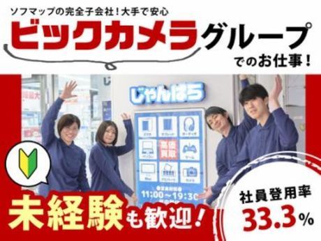仕事内容 ★★このお仕事のポイント★★ ■契約業務は一切なし!未経験でも安心◎ ■マニュアル完備!バイトデビューも大歓迎! ■ビックカメラグループの社員割引あり♪ ■正社員登用制度で社員デビューも歓迎◎ ■最大年3回の昇給で収入UP! <具体的なお仕事内容> スマートフォン/スマホアクセサリ/中古PC等の 買取・販売業務をお任せします。 ■入社してからお任せするお仕事 まずは店内の清掃業務や、レジをお任せ。 商品棚のほこり取りや、ディスプレイを整えたり… お客様が気持ちよくご来店いただけるように、 スタッフ全員で声を掛け合いながら行います。 次のステップは商品の陳列・品出し業務! 社員さんや先輩スタッフが コツを教えますので肩の力を抜いて ゆっくりと丁寧に覚えていただければOKです。 ■慣れてきたらお任せするお仕事 上記のお仕事に慣れてきたら、 お客様の持ち込まれた商品の査定をお任せします! 「機械に詳しくないから不安だな…」という方もご安心を! スマホやPC等の商品モデル(機種名や品番等)を確認したら、 商品の状態レベルを確認! チェックシートで1つ1つ確認する簡単作業なので、 初心者さんでも十分にご活躍いただけます。 また、チェックシートが完成したら、 社員さんが最終チェックをしてくれるので、 ご安心ください◎ だいたい1~3ヵ月くらいで独り立ちできるイメージです! 焦らずコツコツと学んでいきましょう! ■1日の流れ(フルタイムの場合例)■ ◆10:30:朝礼・開店準備◆11:00:開店◆11:00~19:30:検品・ 品出し・レジ打ちetc.※休憩は順番に取ってもらいます♪◆19:3 0~:閉店作業◆19:40:終礼・退勤 <じゃんぱらってどんな会社?> 1997年に創立以来、スマートフォン・パソコン等の買取販売を行っています。 2021年12月には、株式会社ビックカメラの連結子会社である 株式会社ソフマップが当社の全株式を取得し、完全子会社化。 現在に至ります。「ワクワク、ドキドキ」をお客様に提供することを大切にしています。