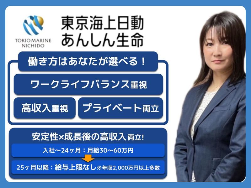 仕事内容 ✨働く女性を応援します✨ \私たちの会社の働きやすさのヒミツ/ ✅スケジュールは自分次第! ✅土日祝休みの完全週休2日制! ✅長期休暇と合せて年間休日は125日! ✅転勤なし!じっくり働きたい方に! ✅頑張りを還元!賞与は年4回支給! <高収入と安定環境を実現できます> ⏩平均年収1000万円以上! 年収1000万円の社員に育てます。 ⏩東証プライム上場/ 東京海上グループの安定企業! ⏩目標や働き方は自分次第! ノルマがないので無理に売る必要はなし。 人生の主導権は自分にあります! <自分らしい働き方を実現できる環境です> ライフパートナーは、 お客様を長くサポートするため、 転勤・異動はありません。 地元でずっと働けます。 スケジュールは自分で調整できるので、 ご家庭や育児・介護との両立もしやすく、 柔軟な働き方が叶います。 また、日々の頑張りがしっかり報酬に反映される仕組みのため、やりがいを持って働ける環境です。 <入社後の2年間は、安心して成長できるサポート体制を整えています。> ⏩安心の給与保証あり! 研修期間の2年間は収入が安定しているので、目の前の業務に集中できます。 ⏩じっくり学べる研修期間! 金融知識からお客様への提案方法まで、基礎からしっかり学べます。 金融・保険業界が初めての方も安心してスタートできます。 ──────────────────── ⭐あなたにお願いしたいお仕事⭐ ──────────────────── お客様のニーズに合った最適な保険プランを ご提案する仕事です! ✅生命保険の提案 ✅顧客のライフスタイルに合わせた 保険内容の見直し ✅保険金や給付金請求の手続き 営業先は個⼈・法⼈・エリア・業界など、 全て⾃分で決めることができます! 例:⼟⽇休みたい→法⼈向けに平⽇業務 平⽇休みたい→個⼈向けに⼟⽇業務 ──────────────────── ⭐ここで働く魅力とは⭐ ──────────────────── <訪問する頻度はどのくらい?> 1日平均3件ですが、 個人の裁量に任されているため、 自分ペースで仕事を進めていただけます。 飛び込みも推奨しておらず、 既存のお客様を大切にし 紹介をいただくサイクルを 大切にしています。 <お客様探しが大変?> お客様を探すのが大変なのでは……? そう思われるかもしれませんが、 会社がお客様を紹介するなどの 他社にはないサポート体制があります。 (代理店連携/マーケット作り支援策) 「東京海上グループ」の看板があるため、 お客様もまずは聞いてみようという⽅が多く、 営業のしやすさを実感していただけます。 また、ご契約者からお客様をご紹介 いただくノウハウの研修もあります! <成長できる環境> 年収1億円超の社員も在籍。 トップセールスからの勉強会など 早期に成果を出せるノウハウを伝授! あなたの「稼ぎたい」「成長したい」を 全力でバックアップします! <メリハリをつけて働けます!> 2年目からは自由度がアップ。 決まった日以外は直行直帰OKなので 時間のロスも最低限で済みます。 休日休暇もしっかりしている上、 有給の取得率は100%! 無理のないペースで働けます。 「趣味を存分に楽しむ」 「家族とゆったりと過ごす」等々、 オフを大切にしたい方に、 おすすめの環境です。 ┏❀✿─────────────✿❀┓ しっかりした収入と 充実したプライベートの双方を、 ぜひ当社で実現してください! ┗❀✿─────────────✿❀┛ <選考に関して> 納得してから、安心してチャレンジできます。 いきなり本格的な面接ではなく、まずはカジュアルな面談で仕事内容や働き方をざっくばらんにお話ししましょう。 「自分に合っているか」をしっかり確認したうえで、納得してから選考に進めます。 気になることや不安な点があれば、何でもご相談ください。お気軽にご応募をお待ちしております。