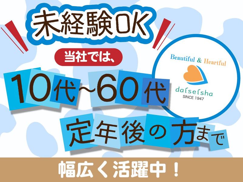 求めている人材 ★未経験OK! ★男性・女性どちらも大歓迎! ★年齢・学歴は問いません。 ◎「キレイ好きの方」 ◎「モクモク集中して働きたい方」 ◎「適度なシフトで働きたい方」 など、大歓迎です♪ 「大清社」では、パートさん、フリーターさん、40代~60代のミドル、シニア世代の方が活躍中♪