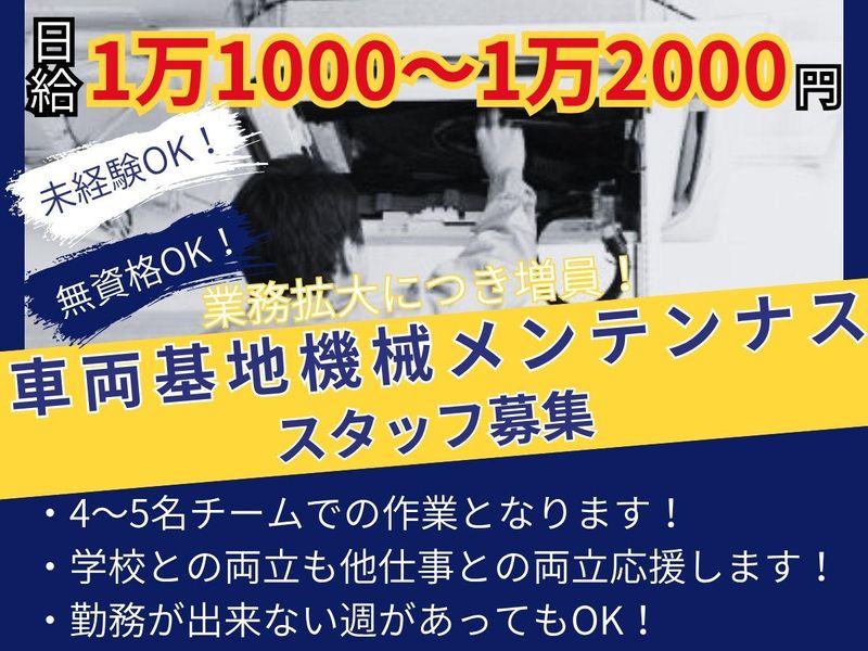 仕事内容 \自由シフト×日給保証×未経験歓迎!/ <ポイント> ●日給1万1000円~1万2000円!高収入バイト ●週1日~/平日のみ/土日のみ/WワークOK ●自由シフト制で学業・家庭・副業と両立可能 ●現場が早く終わっても日給はしっかり保証 ●未経験からでも安心の研修制度あり ●川崎・鶴見・八丁畷駅からアクセス便利/駅近♪ <仕事内容> 業務用エアコンのフィルター交換・点検・洗浄や、車両基地の機械メンテナンス補助をお願いします。 ・難しい作業は一切なし! ・必ず4~5人のチーム作業で安心! ・未経験でも先輩がイチから教えます。 「体を動かす仕事がしたい」 「専門知識はないけど、安定した収入を得たい」 そんな方にピッタリです。 <こんな方におすすめ> ・未経験から安定収入を得たい方 ・学生・フリーター・副業・Wワーク希望の方 ・短時間で効率よく稼ぎたい方 ・身近な場所で長く働きたい方